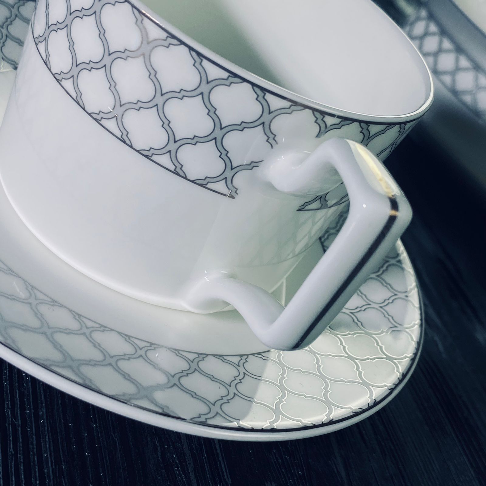 Изысканная коллекция ВЕРСАЛЬ изготовлена из полупрозрачного костяного фарфора. Изысканная палитра, сочетающая в себе нежные оттенки матового серого цвета и серебряного декора, очаровывает своей глубиной и игрой света. Изящный серебряный края, словно лунный свет, обрамляет тарелки. Утонченный рисунок из выполнен с искусной точностью. Коллекция состоит из предметов сервировка, обеденных, чайных и кофейных сервизов.