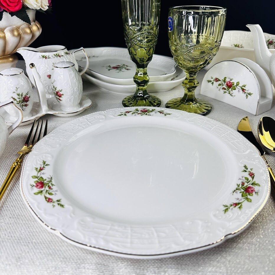 Коллекция ДОМИНИКА выполнена в стиле барокко и производится из белого фарфора c золотой каймой. Изделия украшены рельефным декором, изящно подчеркивающими благородство фарфора, узорные края выглядят элегантно и всегда в тренде посудной моды. В росписи фарфора излюбленным цветком считается роза, вот и мы решили расписать коллекцию английскими розами.