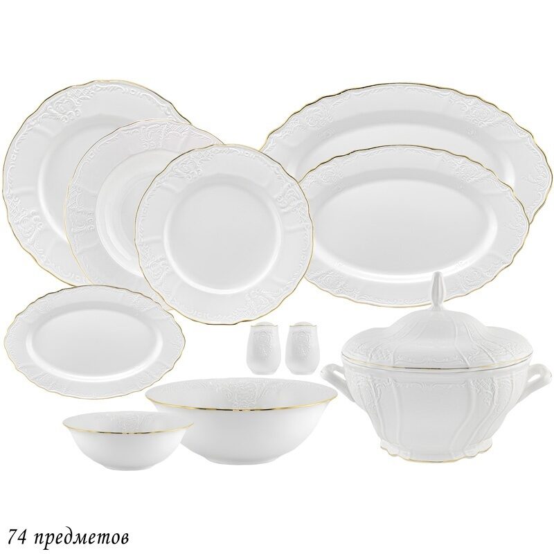 Обеденный сервиз 74пр. maria gold в подарочной упаковке фарфор lenardi. Обеденный сервиз 75 предметов Упаковано в подарочную коробку Коллекция Maria Gold выполнена в стиле барокко и производится из тонкого белого фарфора c золотой каймой. Изделия украшены рельефным декором, изящно подчеркивающими благородство фарфора, узорные края выглядят элегантно и всегда в тренде посудной моды. Кроме наборов и сервизов в серию входят множество отдельных фарфоровых предметов, ассортимент которых с каждым годом расширяется. Эта посуда подходит как для ресторанов, бара и кафе, так и для дома. Наполение: 12шт - тарелки -d=27см 12шт - тарелки -d=25см 12шт - тарелки глубокие -d=23см 12шт - тарелки -d=21,5см 2 шт -супник 2,3 литра-1шт + крышка-1шт 1шт- овал большой - длинна 35см 2шт- овал средний - длинна 30см 4шт- овал мальенкий - длинна 21,5см 1шт- салатник большой -d=23см 12шт- салатник - d=13,5см 2шт- солонка 2шт- перечница Не рекомендуется использовать в микроволновой печи и мыть в посудомоечной машине, по причине возможного повреждения декоративного покрытия.  развернуть описание ▼