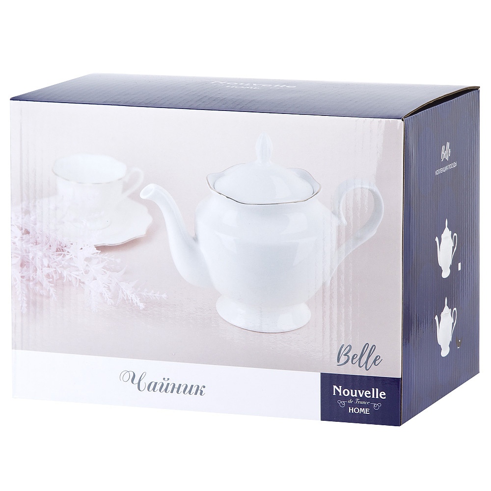 Чайник belle v=1300мл (подарочная упаковка). Чайник Belle v=1300мл (подарочная упаковка) Коллекция Belle от Nouvelle home – классика столового гардероба у вас на столе, идеально сочетающаяся с любым текстилем и столовыми приборами. Белый фарфор открывает неограниченные возможности для ваших собственных сервировок. Представлена коллекция в двух вариантах: торжественный с окантовкой из 24К золота и повседневный без декора. Порадуйте ценителей классического дизайна этой красивой коллекцией. Рекомендации по уходу: не использовать для ухода абразивные моющие средства, изделия с золотой окантовкой не использовать в микроволновой печи. Материал: Фарфор Дизайн: Belle Упаковка: Цветная коробка Объем, мл: 1 300 Цвет основной: Белый Комплектация: Чайник - 1 шт Использование в СВЧ: Да Мытье в посудомоечной машине: Да Рисунок: Без рисунка Форма: Фигурная  развернуть описание ▼