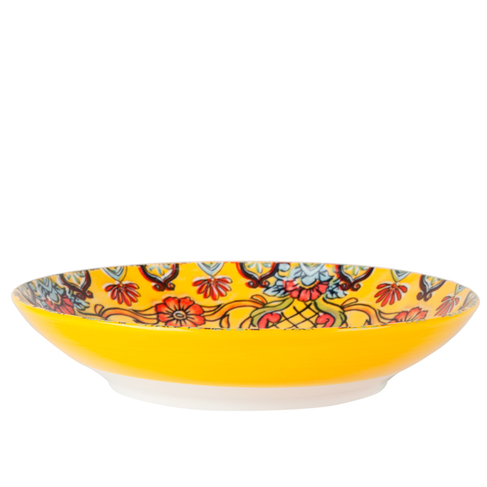 Тарелка arabesque (желтый) 21*21*4,5см (min6). Представляем вашему вниманию новую линейку посуды Arabesque, которая воплотила в себе летний настроение с яркими цветами и узором, напоминающим теплое солнце. Уникальный дизайн этой посуды идеально подходит для создания яркой и стильной атмосферы на вашем столе. Одним из главных преимуществ этой линейки Arabesque является ее функциональность. Данная посуда изготовлена из высококачественного фарфора, который обладает повышенной прочностью и долговечностью. Вы можете быть уверены, что она прослужит вам долгое время, сохраняя свою первоначальную красоту и яркость. Еще одним важным преимуществом этой линейки является ее удобство в использовании. Вы можете безопасно использовать эту посуду в посудомоечной машине, что значительно упрощает процесс ухода за ней. Кроме того, она также может использоваться в микроволновой печи, что позволяет вам быстро и удобно подогреть пищу или приготовить легкий завтрак. Линейка Arabesque включает в себя различные предметы посуды. Вы можете создать свой собственный набор, в котором будут присутствовать только те предметы, которые вам действительно необходимы для вашего повседневного использования или особого случая. Позвольте этой посуде Arabesque украсить ваш стол и добавить в него яркости и уюта. Ее красивый дизайн и практичность не оставят вас равнодушными. Вы сможете наслаждаться каждым приемом пищи и создавать незабываемую атмосферу для ваших близких и гостей. Покупайте линейку посуды Arabesque уже сегодня и ощутите всю ее прелесть и практичность! Тарелка Arabesque (желтый) 21*21*4,5см (min6) Упаковка: Без индивидуальной упаковки Объем, мл: 700 Диаметр, см: 21 Цвет основной: Желтый Комплектация: Тарелка - 1 шт Использование в СВЧ: Да Мытье в посудомоечной машине: Да Рисунок: Узор Форма: Круглая  развернуть описание ▼