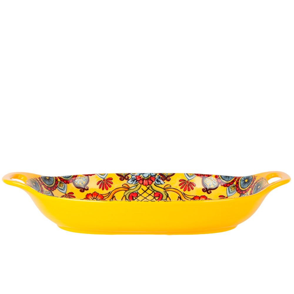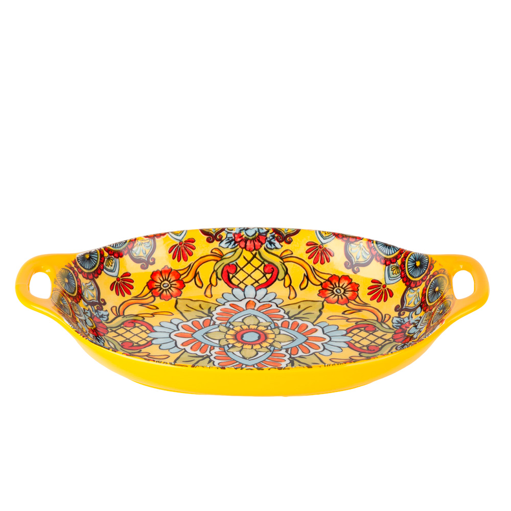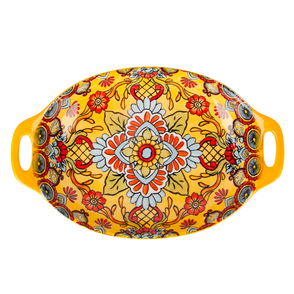 Блюдо с ручками arabesque (желтый) 31*20*5см (min6). Представляем вашему вниманию новую линейку посуды Arabesque, которая воплотила в себе летний настроение с яркими цветами и узором, напоминающим теплое солнце. Уникальный дизайн этой посуды идеально подходит для создания яркой и стильной атмосферы на вашем столе. Одним из главных преимуществ этой линейки Arabesque является ее функциональность. Данная посуда изготовлена из высококачественного фарфора, который обладает повышенной прочностью и долговечностью. Вы можете быть уверены, что она прослужит вам долгое время, сохраняя свою первоначальную красоту и яркость. Еще одним важным преимуществом этой линейки является ее удобство в использовании. Вы можете безопасно использовать эту посуду в посудомоечной машине, что значительно упрощает процесс ухода за ней. Кроме того, она также может использоваться в микроволновой печи, что позволяет вам быстро и удобно подогреть пищу или приготовить легкий завтрак. Линейка Arabesque включает в себя различные предметы посуды. Вы можете создать свой собственный набор, в котором будут присутствовать только те предметы, которые вам действительно необходимы для вашего повседневного использования или особого случая. Позвольте этой посуде Arabesque украсить ваш стол и добавить в него яркости и уюта. Ее красивый дизайн и практичность не оставят вас равнодушными. Вы сможете наслаждаться каждым приемом пищи и создавать незабываемую атмосферу для ваших близких и гостей. Покупайте линейку посуды Arabesque уже сегодня и ощутите всю ее прелесть и практичность! Блюдо с ручками Arabesque (желтый) 31*20*5см (min6) Упаковка: Без индивидуальной упаковки Объем, мл: 1000 Цвет основной: Желтый Комплектация: Блюдо - 1 шт Использование в СВЧ: Да Мытье в посудомоечной машине: Да Рисунок: Узор Форма: Овальная  развернуть описание ▼