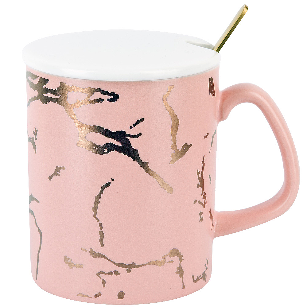 Кружка с крышкой и ложкой розовый мрамор (розовая) V=380 мл (подарочная уп
