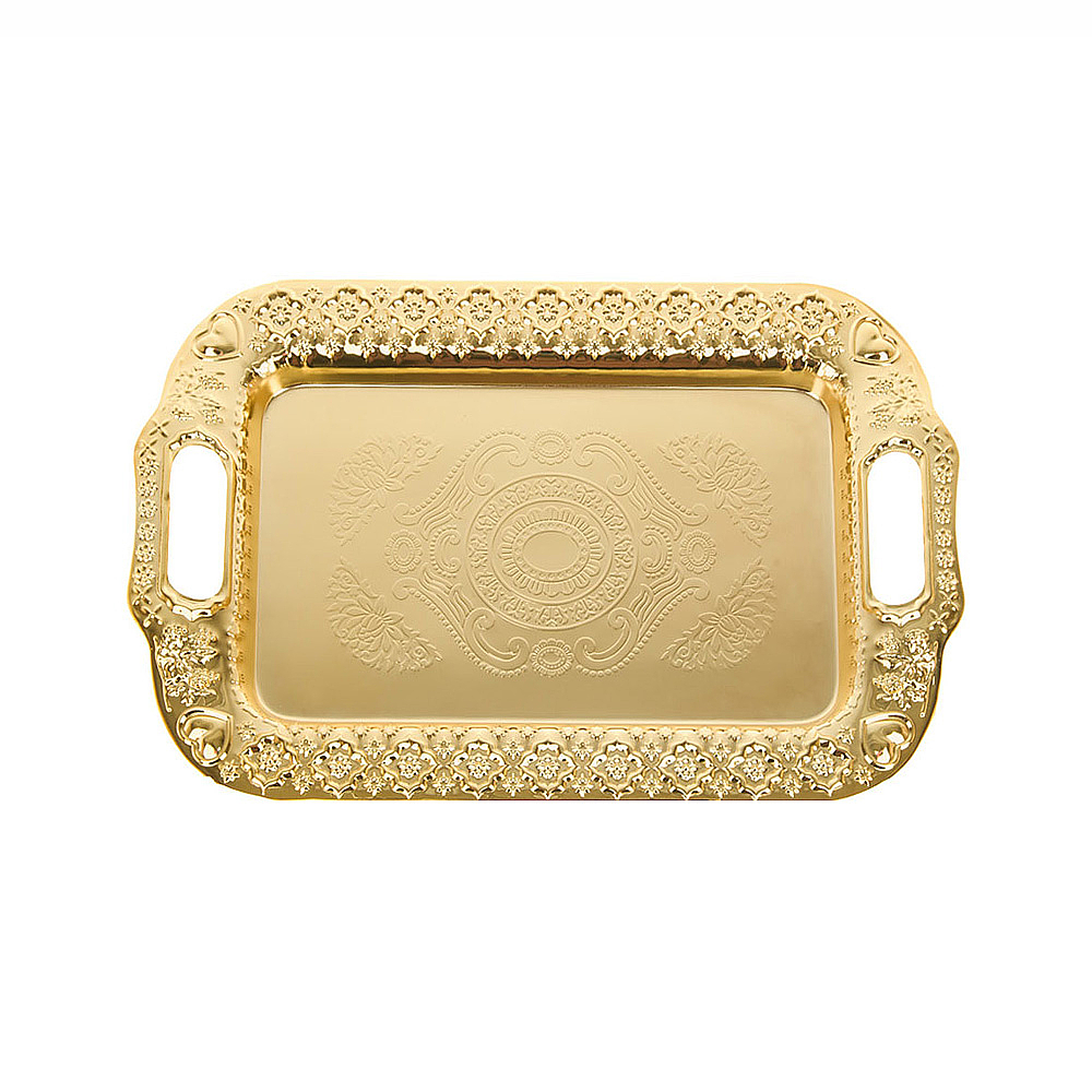 Поднос сервировочный (золото) 34*22,5*3см. (металл с гальваническим покрыт. Поднос сервировочный (золото) 34*22,5*2,5см. (металл с гальваническим покрытием) (упаковочный пакет) Материал: Железо с гальваническим покрытием , АБС ручки Упаковка: opp bag with sticker Цвет основной: Золото Комплектация: Поднос - 1 шт Использование в СВЧ: Нет Мытье в посудомоечной машине: Нет Рисунок: Узор Форма: Прямоугольная  развернуть описание ▼