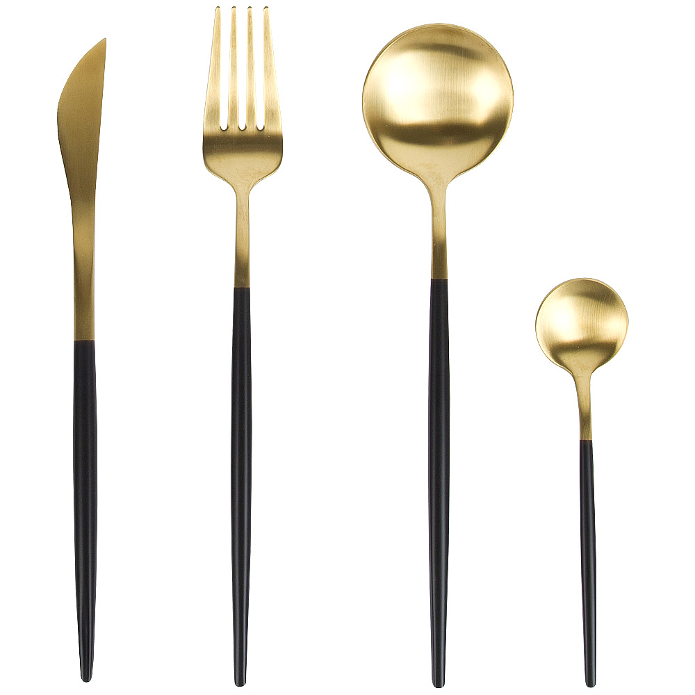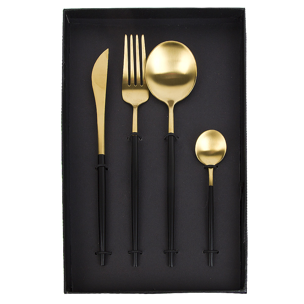 Набор столовых приборов 4 предмета (подарочная упаковка). Набор столовых приборов 4 предмета (нож столовый,вилка столовая,ложка столовая, ложка чайная)(нержавеющая сталь)( подарочная упаковка) Материал: Нержавеющая сталь Упаковка: Черная коробка Цвет основной: Золото Комплектация: Нож - 1 шт , вилка - 1 шт , ложка столовая - 1 шт , ложка чайная - 1 шт Использование в СВЧ: Нет Мытье в посудомоечной машине: Нет Рисунок: Без рисунка
