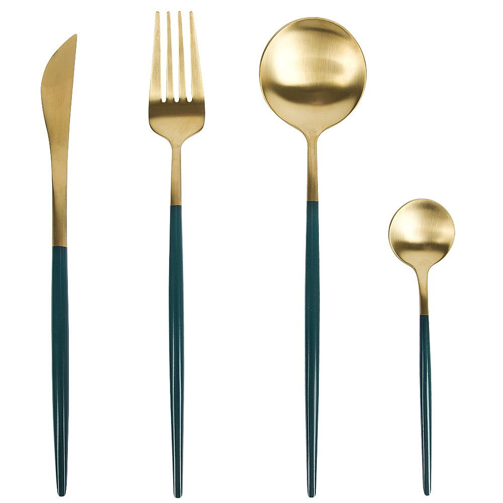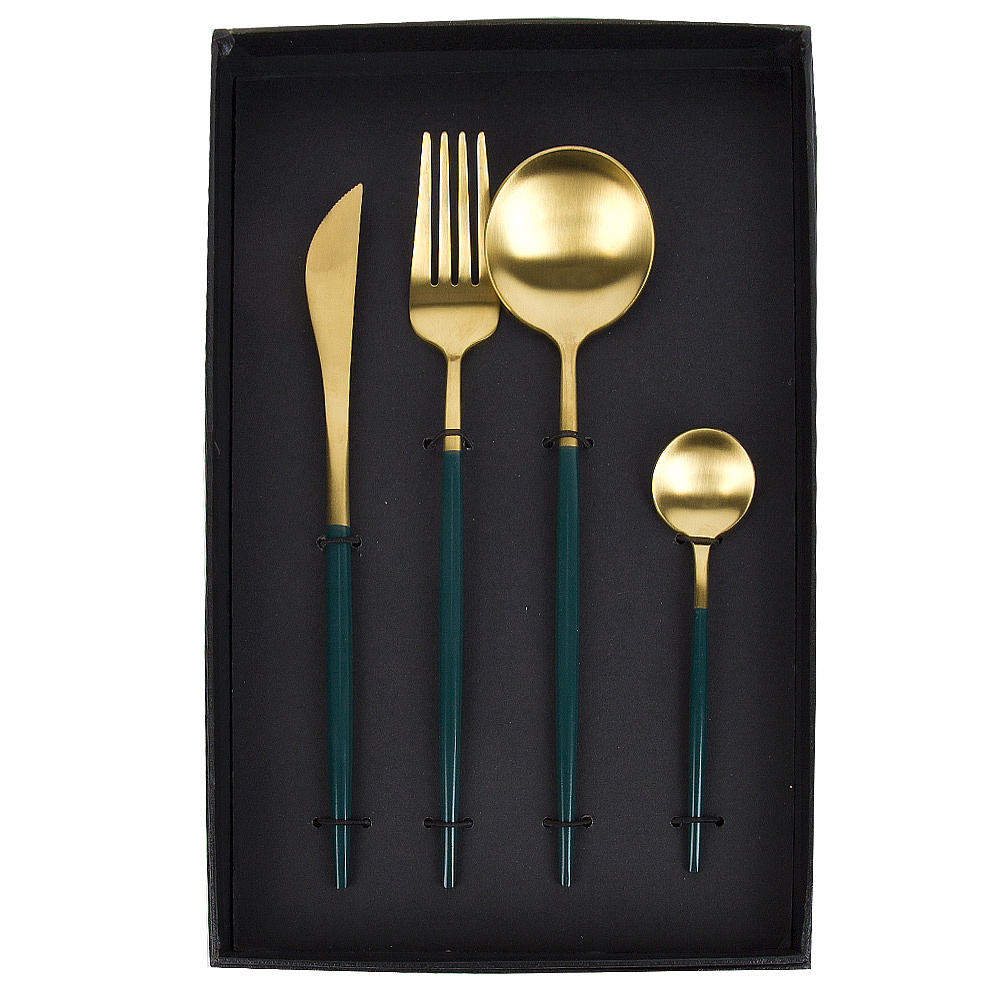Набор столовых приборов 4 предмета (подарочная упаковка). Набор столовых приборов 4 предмета (нож столовый,вилка столовая,ложка столовая, ложка чайная)(нержавеющая сталь)( подарочная упаковка) Материал: Нержавеющая сталь Упаковка: Черная коробка Цвет основной: Золото Комплектация: Нож - 1 шт , вилка - 1 шт , ложка столовая - 1 шт , ложка чайная - 1 шт Использование в СВЧ: Нет Мытье в посудомоечной машине: Нет Рисунок: Без рисунка