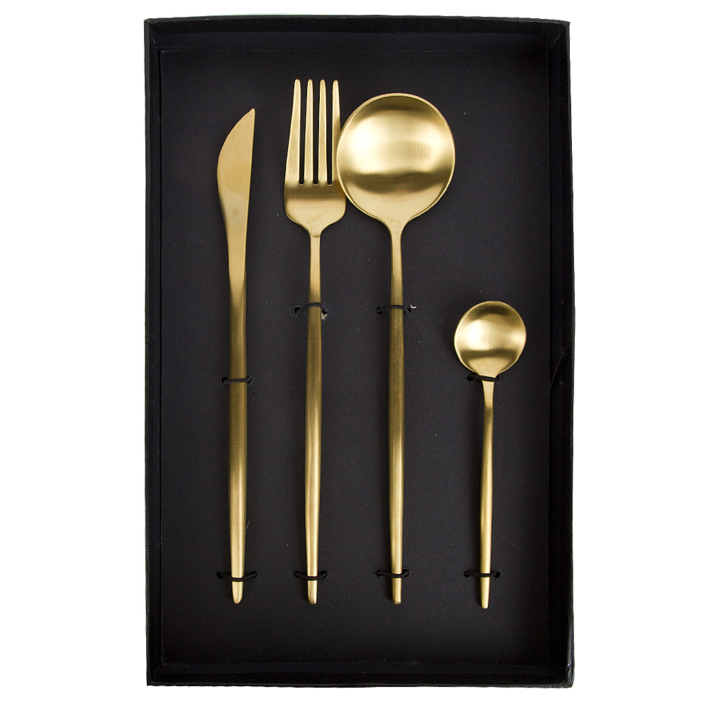 Набор столовых приборов 4 предмета (подарочная упаковка). Набор столовых приборов 4 предмета (нож столовый,вилка столовая,ложка столовая, ложка чайная)(нержавеющая сталь)( подарочная упаковка) Материал: Нержавеющая сталь Упаковка: Черная коробка Цвет основной: Золото Комплектация: Нож - 1 шт , вилка - 1 шт , ложка столовая - 1 шт , ложка чайная - 1 шт Использование в СВЧ: Нет Мытье в посудомоечной машине: Нет Рисунок: Без рисунка