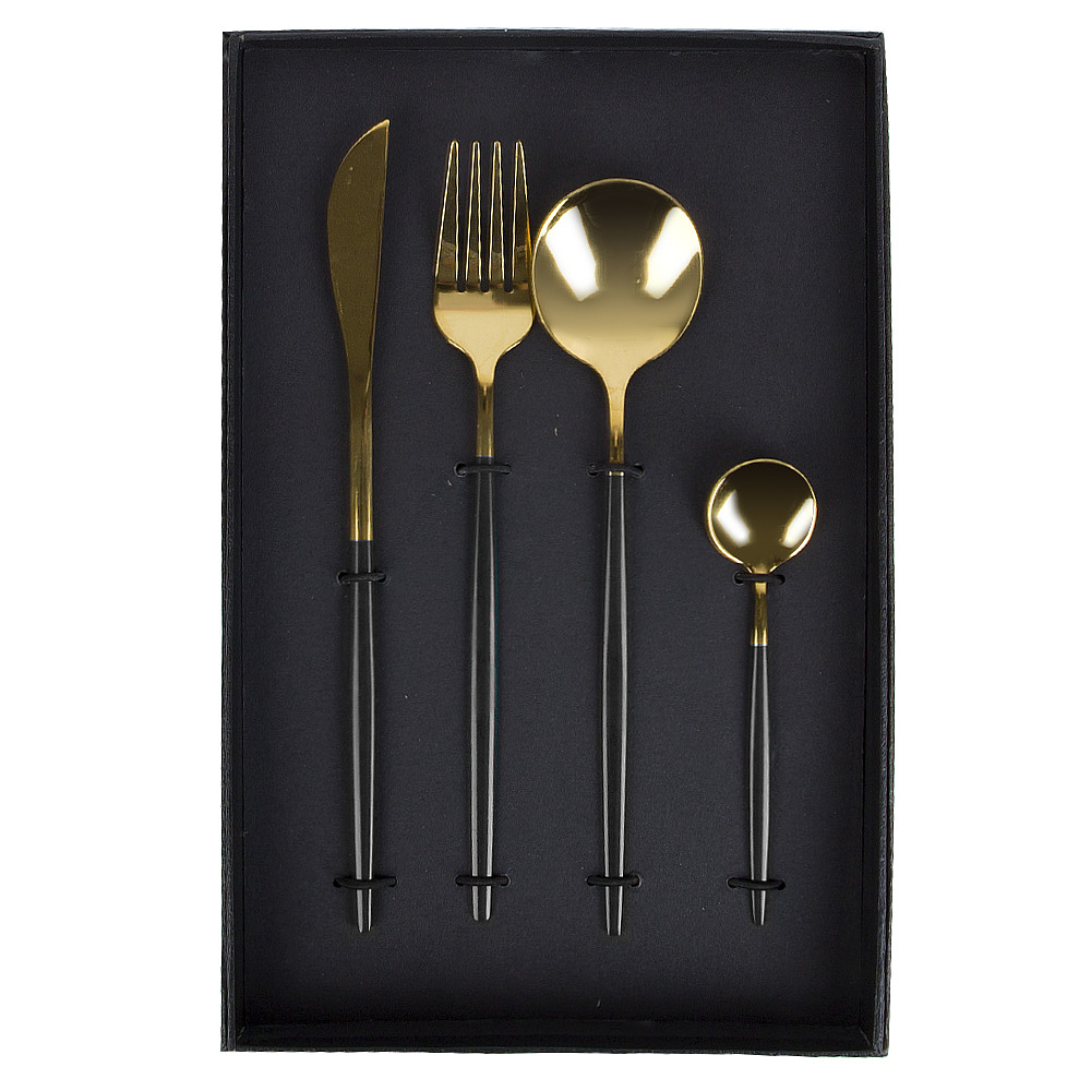 Набор столовых приборов 4 предмета (нож столовый,вилка столовая,ложка столовая, ложка чайная)(нержавеющая сталь)( подарочная упаковка) Материал: Нержавеющая сталь Упаковка: Черная коробка Цвет основной: Золото Комплектация: Нож - 1 шт , вилка - 1 шт , ложка столовая - 1 шт , ложка чайная - 1 шт Использование в СВЧ: Нет Мытье в посудомоечной машине: Нет Рисунок: Без рисунка
