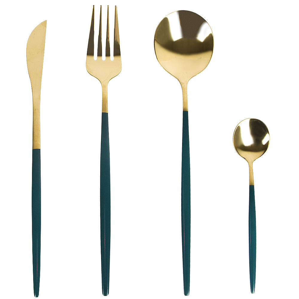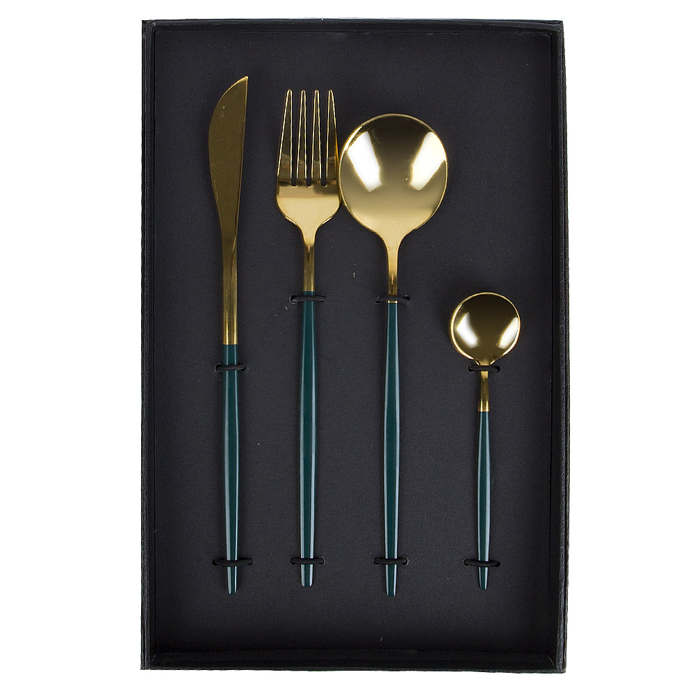 Набор столовых приборов 4 предмета (подарочная упаковка). Набор столовых приборов 4 предмета (нож столовый,вилка столовая,ложка столовая, ложка чайная)(нержавеющая сталь)( подарочная упаковка) Материал: Нержавеющая сталь Упаковка: Черная коробка Цвет основной: Золото Комплектация: Нож - 1 шт , вилка - 1 шт , ложка столовая - 1 шт , ложка чайная - 1 шт Использование в СВЧ: Нет Мытье в посудомоечной машине: Нет Рисунок: Без рисунка