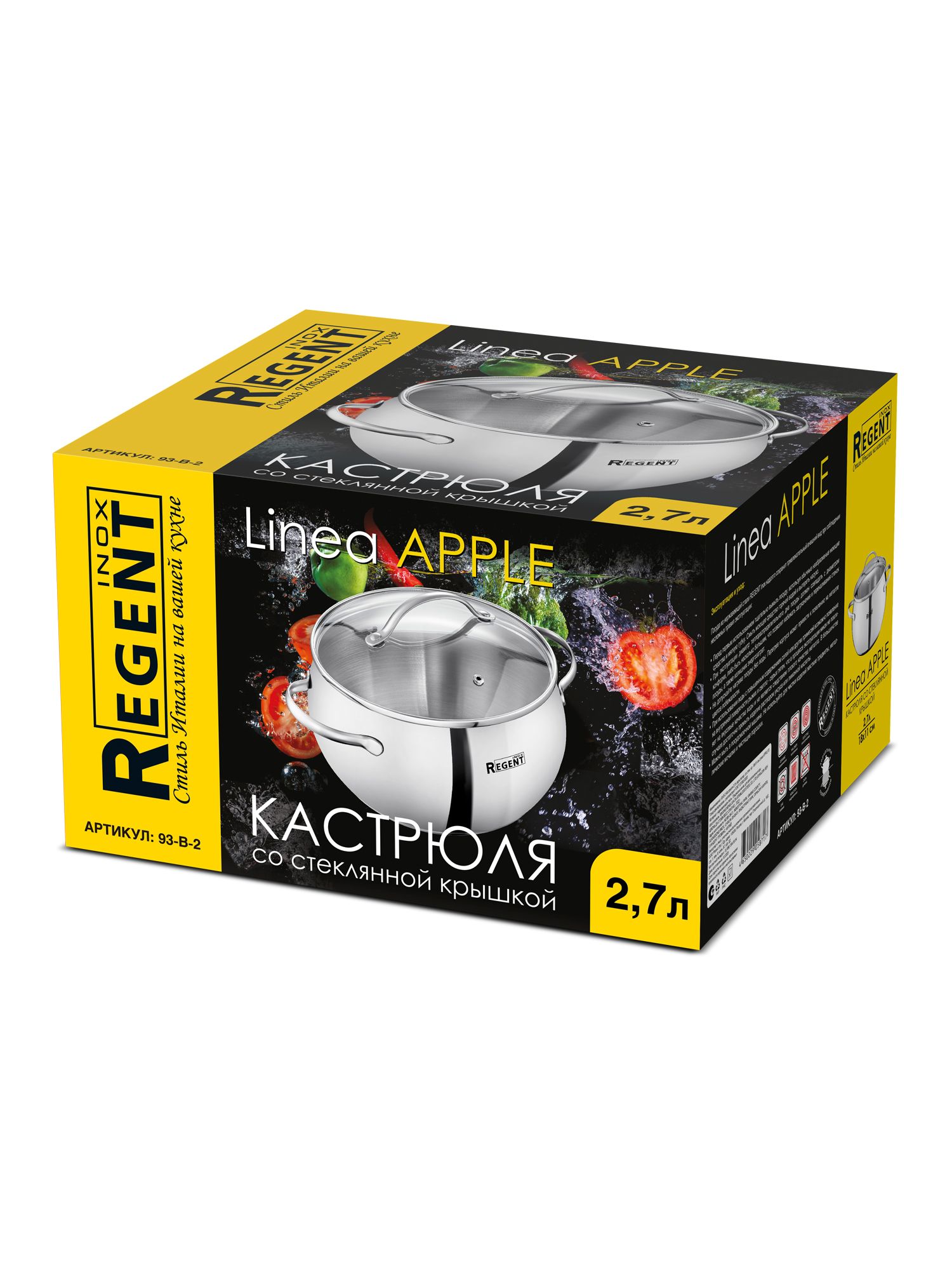 93-b-2 кастрюля 2,7л зерк.полир. со стек. кр. 18х11 см linea apple b. Кастрюля 2,7л нерж. сталь 18/10 округлая форма толщина дна - 4. 8мм; толщина стенок - 0,8мм, зеркальное полирование, ручки металические (точечная сварка), крышка из боросиликатного стекла использование: индукционные, электрические, газовые, керамические, галогеновые плиты и посудомоечная машина упаковка: цветной картон 18х11см Linea Apple В Материал изготовления: нержавсталь Общая длина изделия, мм: 265 Ширина изделия, мм: 190 Линия: APPLE B Ширина индивидуальной упаковки, мм: 205 Высота индивидуальной упаковки, мм: 140 Вес единичного товара нетто, кг: 1. 354 Литраж, л: 2. 7 Высота изделия до самой высокой точки изделия, мм: 185 Толщина стенок, мм: 0. 8 Толщина дна, мм: 4. 8 Диаметр индукционного дна, мм: 150 Штрихкод товара в транспортной упаковке: 14650229058714 Техданные: Размер изделия: 265х190х185 мм; Вес: 1,354кгМатериал изготовления: нержавсталь Литраж: 2,7лТолщина дна: 4,8ммТолщина стенок: 0,8мм. Длина индивидуальной упаковки, мм: 230 Высота изделия (внешняя по борту изделия), мм: 120