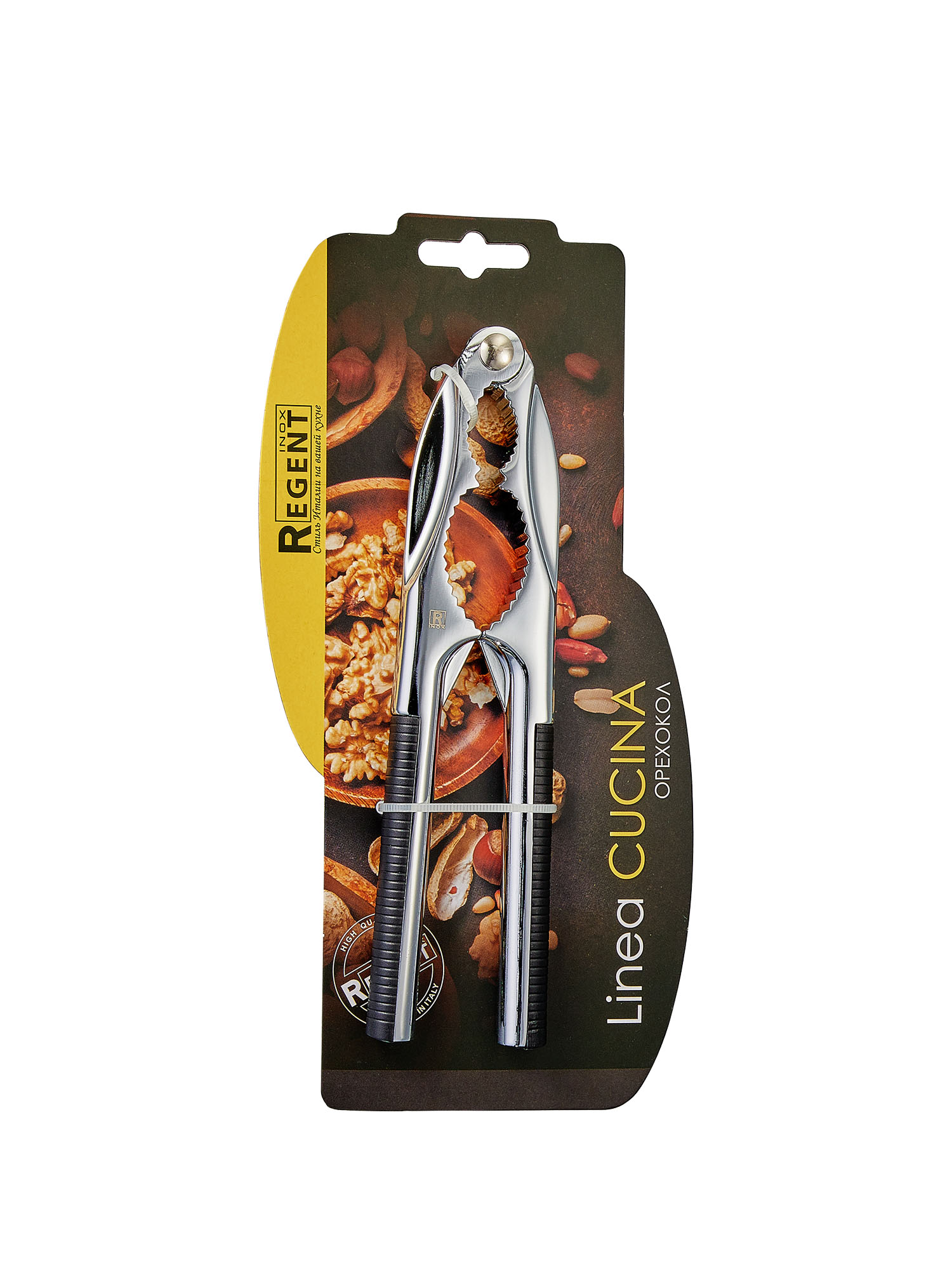 93-cn-01-04 орехокол linea cucina. Если вы - любитель погрызть орехи, у нас есть специальный кухонный аксессуар, который облегчит вам жизнь - это орехокол. Изделие Regent Inox Cucina, благодаря выемкам различного диаметра, прекрасно поможет расколоть орехи различных габаритов: грецкие, лесные или арахис. Модель 93-CN-01-04 изготовлена из нержавеющей стали и максимально безопасна в эксплуатации: специальный механизм орехокола дает возможность достать ядро ореха полностью, почти без повреждения. Удобные нескользящие ручки с пластиковыми вставками не вырвутся из ваших рук в ответственный момент. Материал изготовления: цинковый сплав Общая длина изделия, мм: 165 Ширина изделия, мм: 40 Линия: CUCINA Ширина индивидуальной упаковки, мм: 110 Высота индивидуальной упаковки, мм: 210 Вес единичного товара нетто, кг: 0. 149 Высота изделия до самой высокой точки изделия, мм: 10 Можно использовать в микроволновой печи?: Нет Можно использовать в духовом шкафу?: Нет Можно мыть в посудомоечной машине?: нельзя Штрихкод товара в транспортной упаковке: 14650229054174 Техданные: Размер изделия: 165х40х10 мм; Вес: 0,149 кг; Материал изготовления: цинковый сплав. Длина индивидуальной упаковки, мм: 13 Высота изделия (внешняя по борту изделия), мм: 10