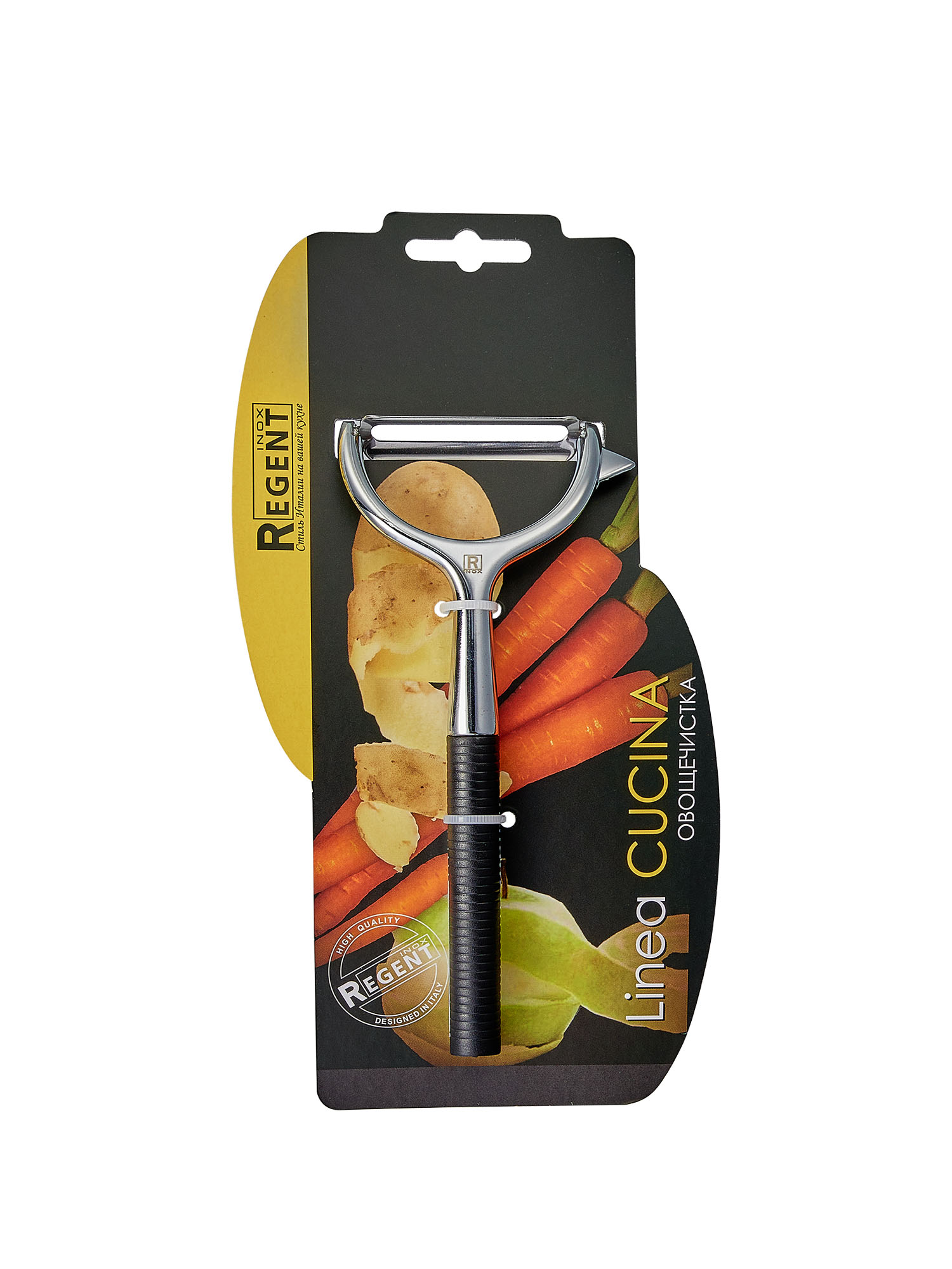 93-cn-01-05 овощечистка поперечная linea cucina. Овощечистка Linea CUCINA от Regent с поперечным лезвием дает возможность прорезать по продукту, убирая кожуру, однако, не нарушая единство продукта. Эта посуда выполнена из нержавеющей стали и черного пластика. Классический дизайн, компактность и удобство изделия позволяет данной овощечистке использоваться на любой кухне как дома, так и в ресторане. Посуда 93-CN-01-05 идеально подходит для чистки картофеля, огурцов или моркови. Боковой нож-петелька позволяет удалять трещины, глазки и поможет сделать декоративные украшения из продуктов. Материал изготовления: цинкосплав Общая длина изделия, мм: 160 Ширина изделия, мм: 65 Линия: CUCINA Ширина индивидуальной упаковки, мм: 115 Высота индивидуальной упаковки, мм: 210 Вес единичного товара нетто, кг: 0. 06 Высота изделия до самой высокой точки изделия, мм: 10 Можно использовать в микроволновой печи?: Нет Можно использовать в духовом шкафу?: Нет Можно мыть в посудомоечной машине?: нельзя Штрихкод товара в транспортной упаковке: 14650229054181 Техданные: Размер изделия: 160х65х10 мм; Вес: 0,06 кг; Материал изготовления: цинкосплав. Длина индивидуальной упаковки, мм: 10 Высота изделия (внешняя по борту изделия), мм: 10