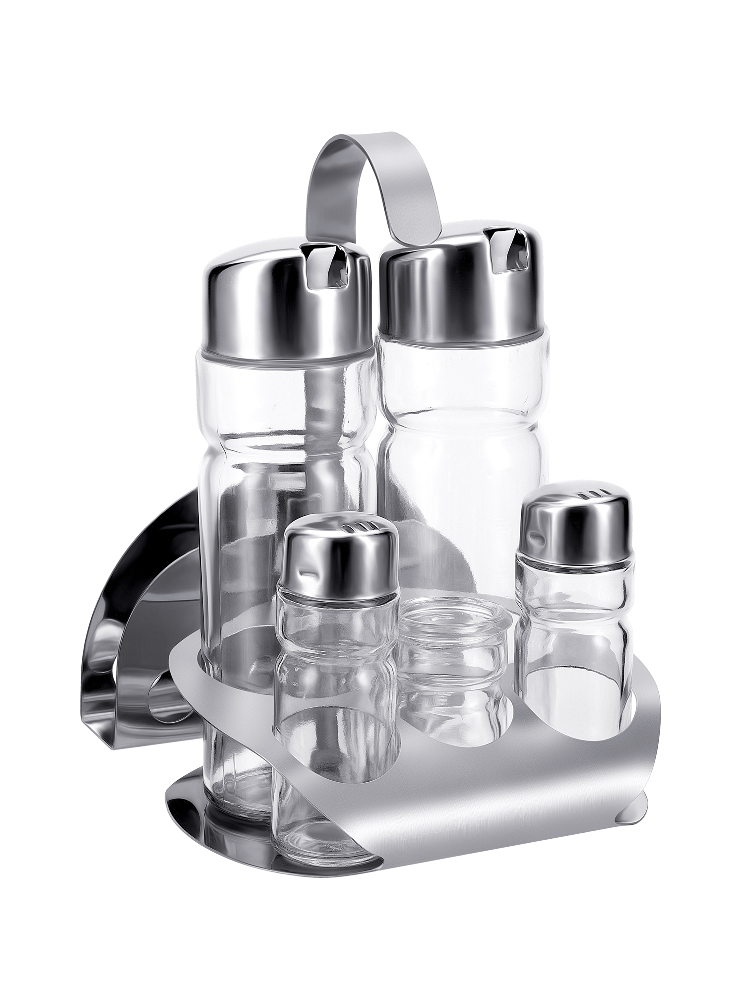 Комфорт на кухне зависит от мелочей, и незаменимым атрибутом будет кухонный комплект для специй. Набор включает в себя емкости, которые установлены на стильной подставке с ручкой. Универсальные баночки можно использовать как для приправ соль #43;перец, так и для масла, соевого соуса и прочих продуктов. Прозрачными баночками пользоваться очень удобно, видно, какая именно приправа в них лежит, а также узнать, когда запас специй следует пополнить. Переносная подставка позволяет легко переносить все предметы сервировки, а стильное оформление делает наборы Linea AROMA подходящими как для каждодневной сервировки стола дома, так и для ресторанов, кафе и других заведений общественного питания. • Набор для специй 93-DE-AR-19 включает в себя 2 баночки для сыпучих специй, две баночки для масла, соевого соуса и прочих продуктов, а также подставку для зубочисток и для салфеток. • Эргономичная ручка позволяет легко переносить все предметы сервировки. • Стеклянные баночки позволяют видеть количество приправ и их наполнение.