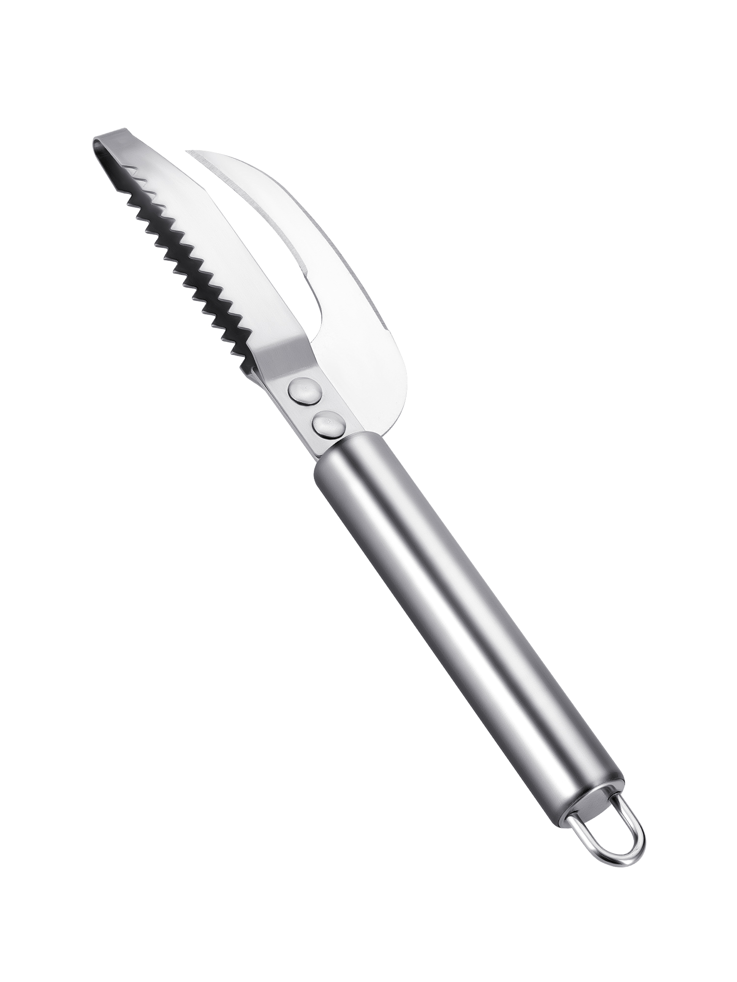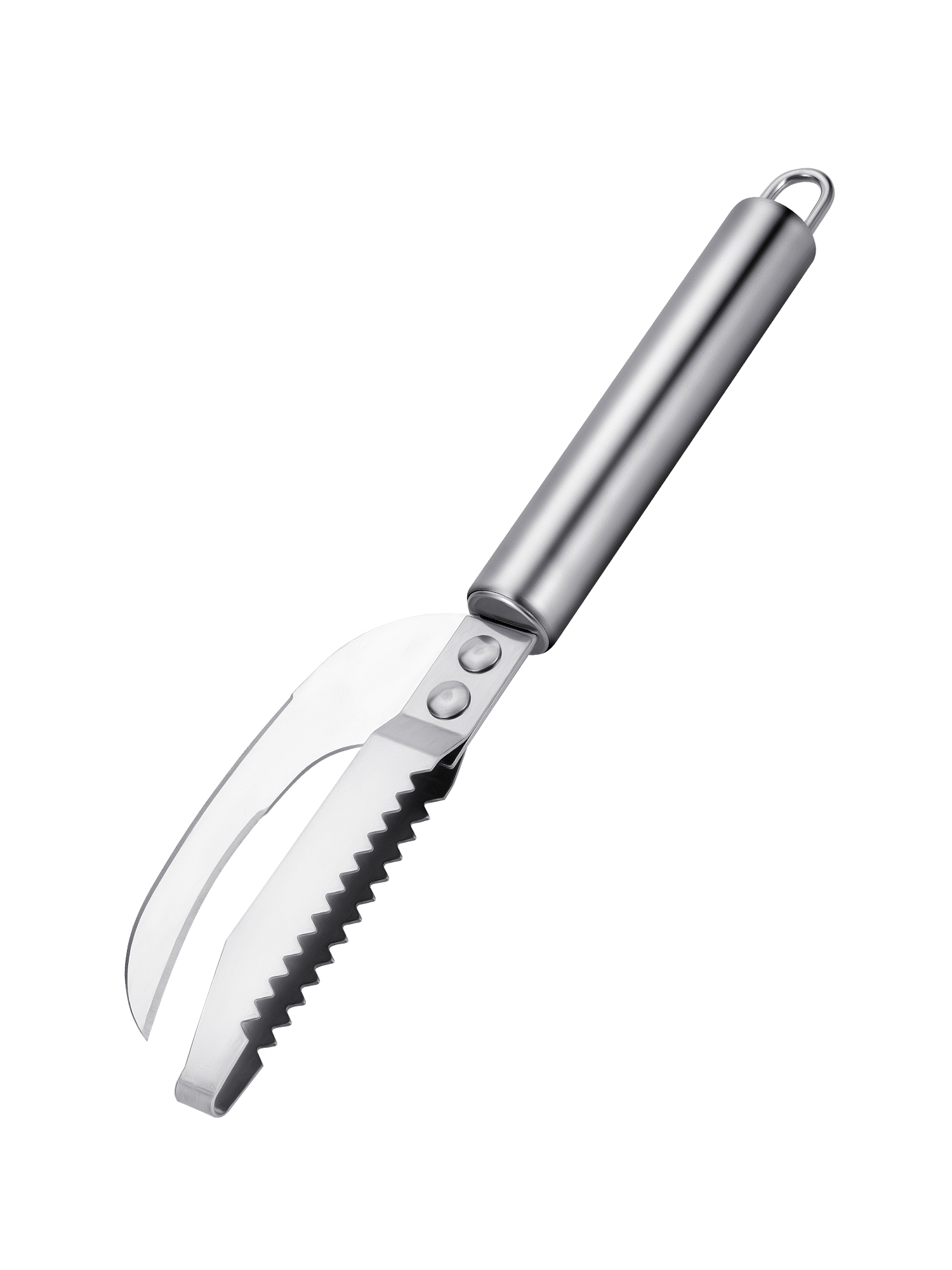 Применение: ножом с двойным рядом зубчиков можно легко и без усилий снять чешую, внутренним лезвием ножа надрезать и освободить от внутренностей брюхо рыбы, внешним лезвием отрезать хвост, плавники, жабры, надрезать хребет и нарезать рыбу на куски любой толщины. Нож выполнен из прочной нержавеющей стали, он не ломается даже при активном использовании. Не впитывает запахов, легко моется вручную, также можно мыть в посудомоечной машине. С помощью отверстия для подвешивания нож можно удобно разместить на крючке. Кухонный металлический нож 2 в 1- полезная кухонная утварь и настоящая находка для любителей рыбы!