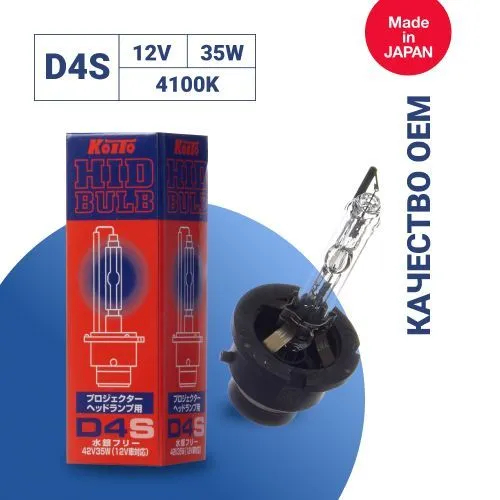 Лампа ксеноновая koito d4s 4100k 12v (42v 35w) (уп. 1 шт.) арт. 3510k/t. Ксеноновые лампы Газоразрядные лампы для автомобильных фар появились не так давно - в начале 90-х годов. Работают они совсем по другому принципу - в среде газа (чаще всего - ксенона) зажигается электрическая дуга, формирующая небольшую сферу горящего газа с почти солнечной температурой. Излучаемый в процессе горения свет настолько яркий, что иногда кажется голубым. Ксеноновые лампы имеют целый ряд преимуществ: они долговечны, не боятся вибраций, а излучаемая ими энергия света в 5-5,5 раза выше, чем у обычных ламп накаливания и в 3 раза больше, чем у галогенных. Газоразрядные лампы обеспечивают более качественное освещение и лучше воспринимаются человеческим глазом, что во время длительных ночных поездок снижает утомляемость и как следствие способствует повышению безопасности на дороге. Устанавливаются фары с ксеноновыми лампами, как правило, в заводских условиях, реже в процессе эксплуатации на модели, где предусмотрено их использование. Помимо специального рефлектора и рассеивателя, для работы газоразрядных ламп необходимы компактные преобразователи электрической энергии для выработки большого стартового напряжения - порядка 20 тыс. вольт, ток определенной частоты для поддержания газового разряда, а также динамическая система регулировки фар для исключения ослепления встречных водителей при различной загрузке автомобиля, в процессе торможения и разгона, при движении по неровным дорогам.  развернуть описание ▼