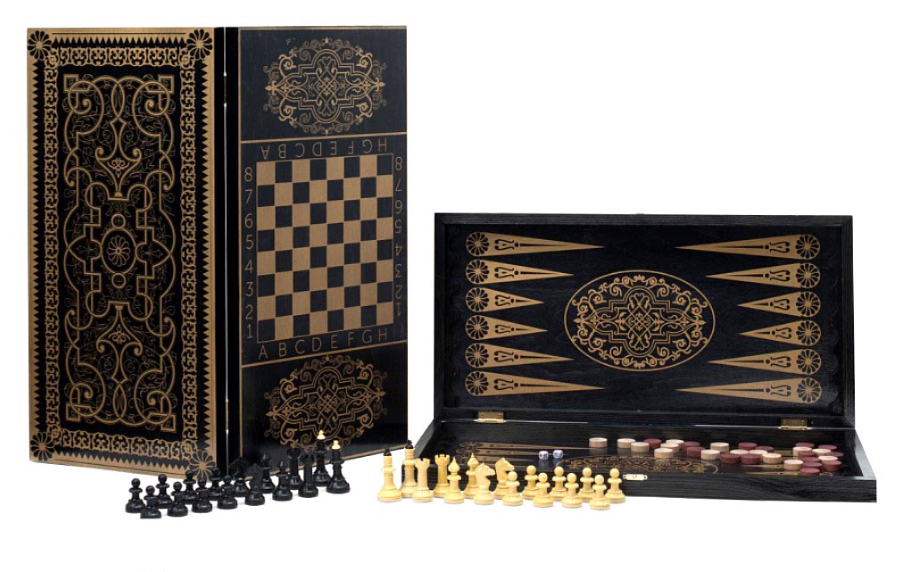 Игра 3в1 большая черная, рисунок золото с обиходными деревянными шахматами