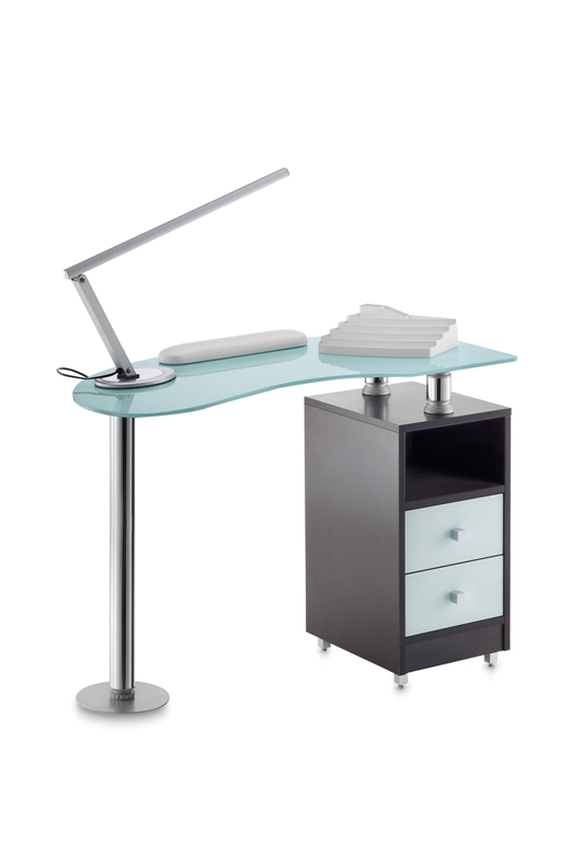 Стол маникюрный 486 l. Маникюрный стол с одной тумбой, столешница из стекла, тумба из дерева. Тумба маникюрного стола оснащена нишей для хранения инструментов и двумя выдвижными ящиками, фронтальная часть ящиков покрыта стеклом. В комплекте: лампа, валик маникюрный, подставка под лаки. Цвет тумбы на выбор: - белый; - венге. Вес: 39 кг; Объем: 0,34 м³; Количество мест: 3. Размер (ДхШхВ): 110x55x77 см Стоимость модели, представленной на фото, может отличаться от цены, указанной на сайте. Артикул: 486 L Бренд: Artecno