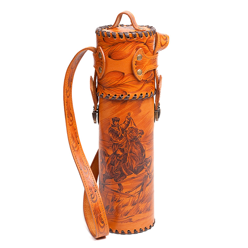 Термос походный 1л в оплетке из натуральной кожи. 1. Термос из нержавеющей стали V=1л 1 шт. 2. Кожаный чехол типа «Тубус» с крышкой и наплечным ремнем 1 шт. 1. Чехол из спанбонда (нетканый мягкий материал) 1шт.