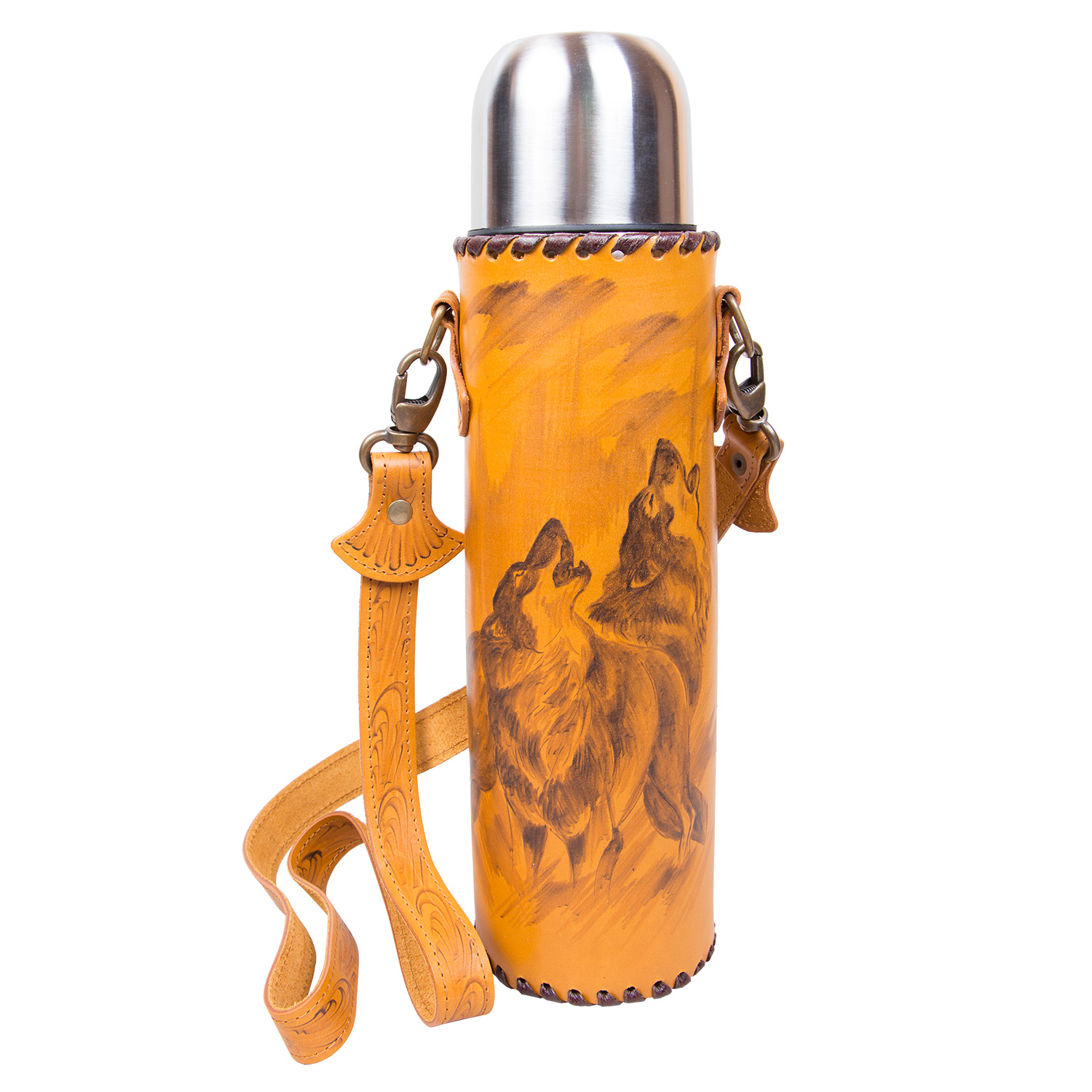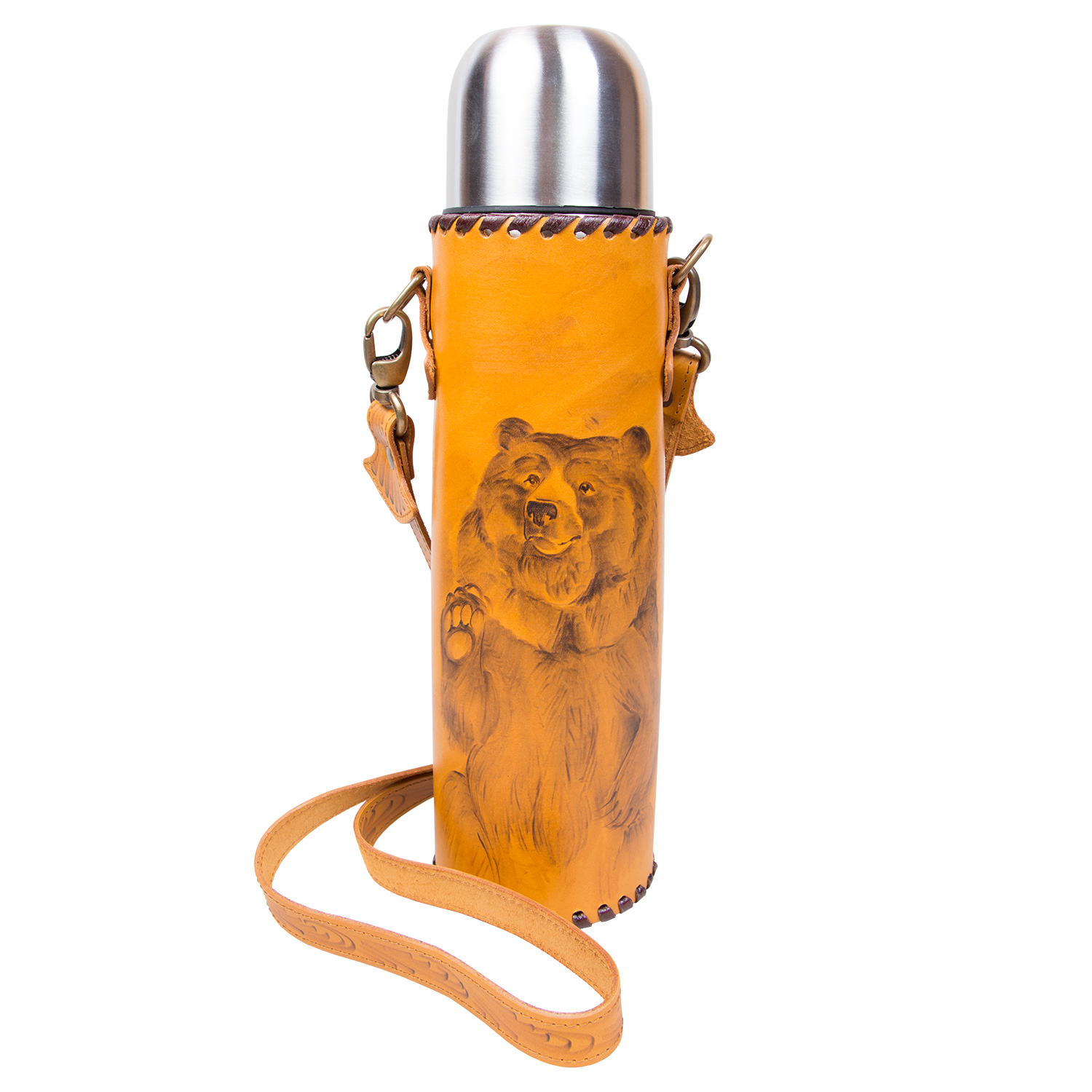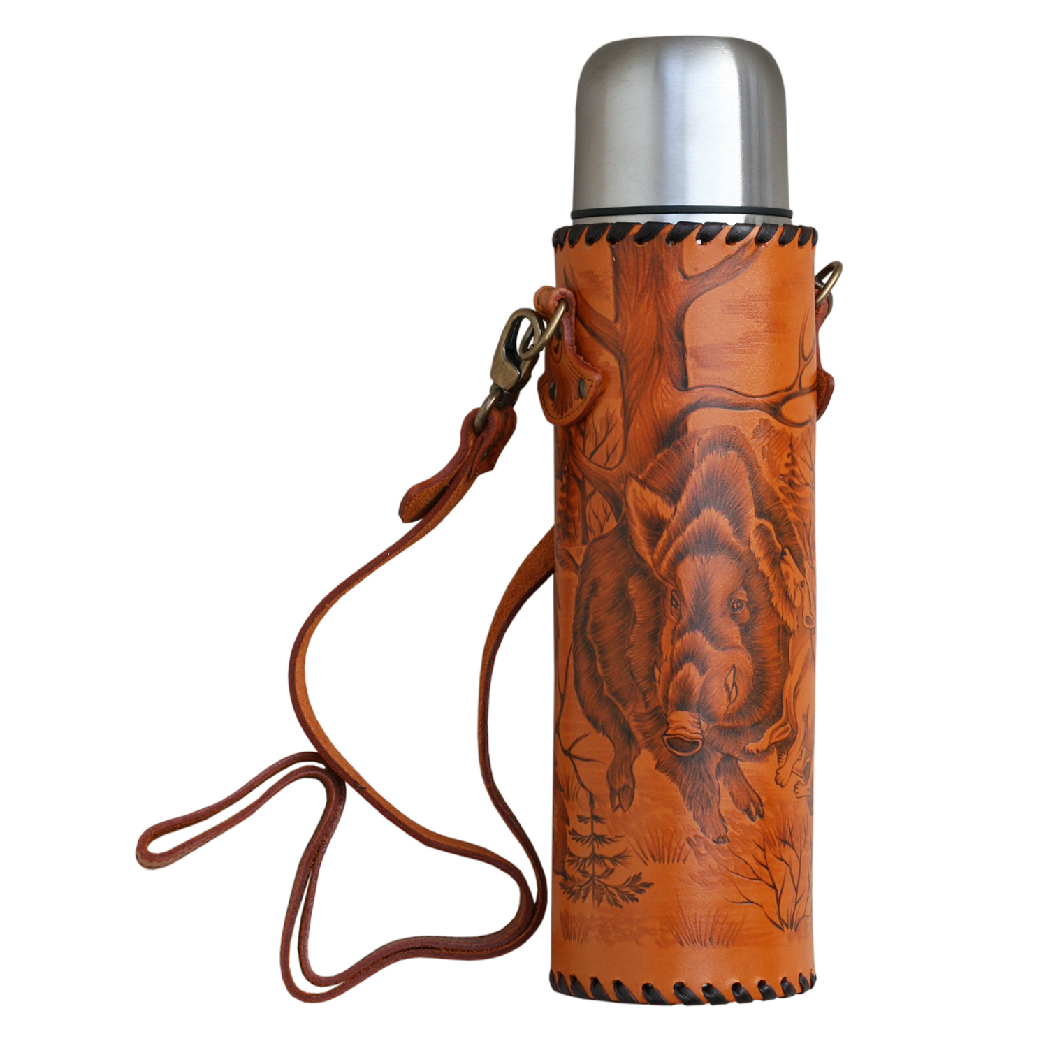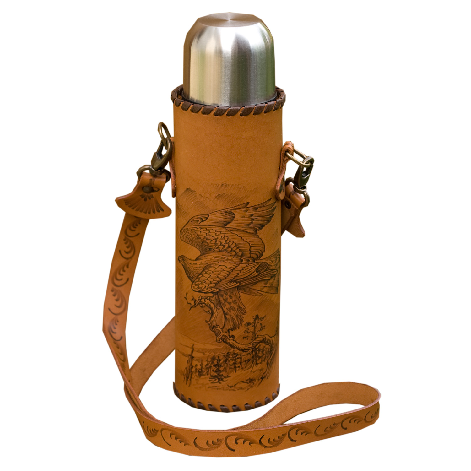 Термос походный 1л в оплетке из натуральной кожи. 1. Термос из нержавеющей стали V=1л 1шт. 2. Кожаный чехол типа «Тубус» с наплечным ремнем 1шт. 3. Чехол из спанбонда (нетканый мягкий материал) 1шт.
