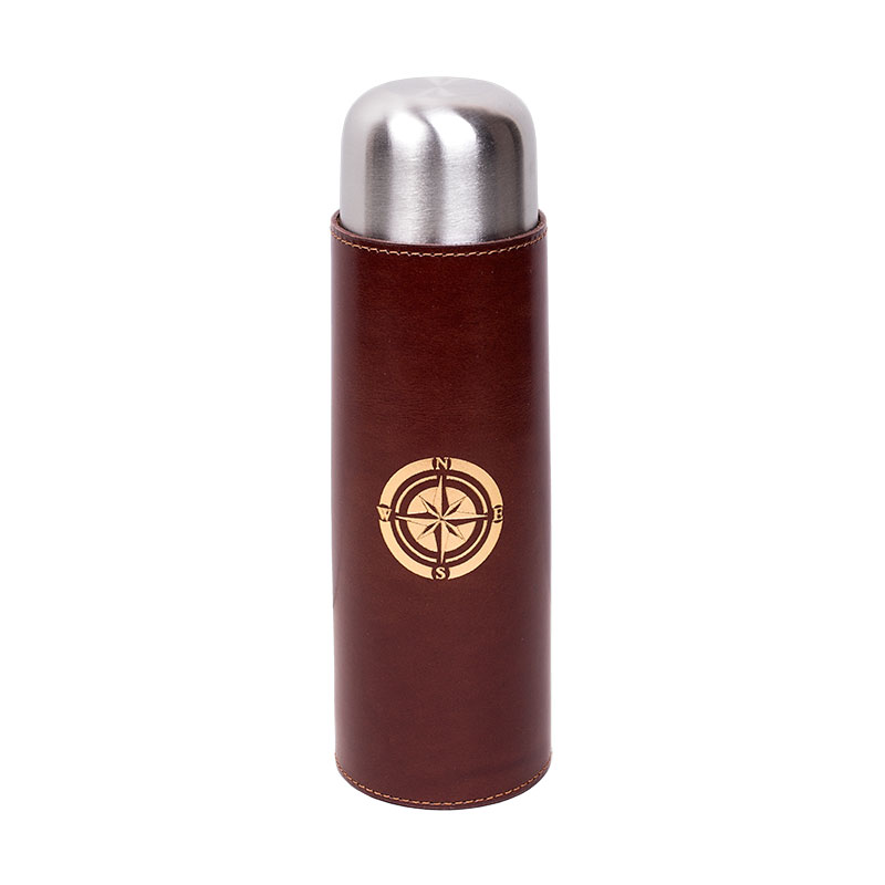 Термос походный 0,5л в чехле из натуральной кожи. 1. Термос из нержавеющей стали 0,5 л в чехле из натуральной кожи с тиснением рисунка 1 шт. 2. Чехол из спанбонда (нетканый мягкий материал) 1 шт.