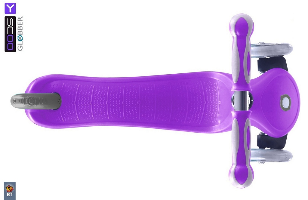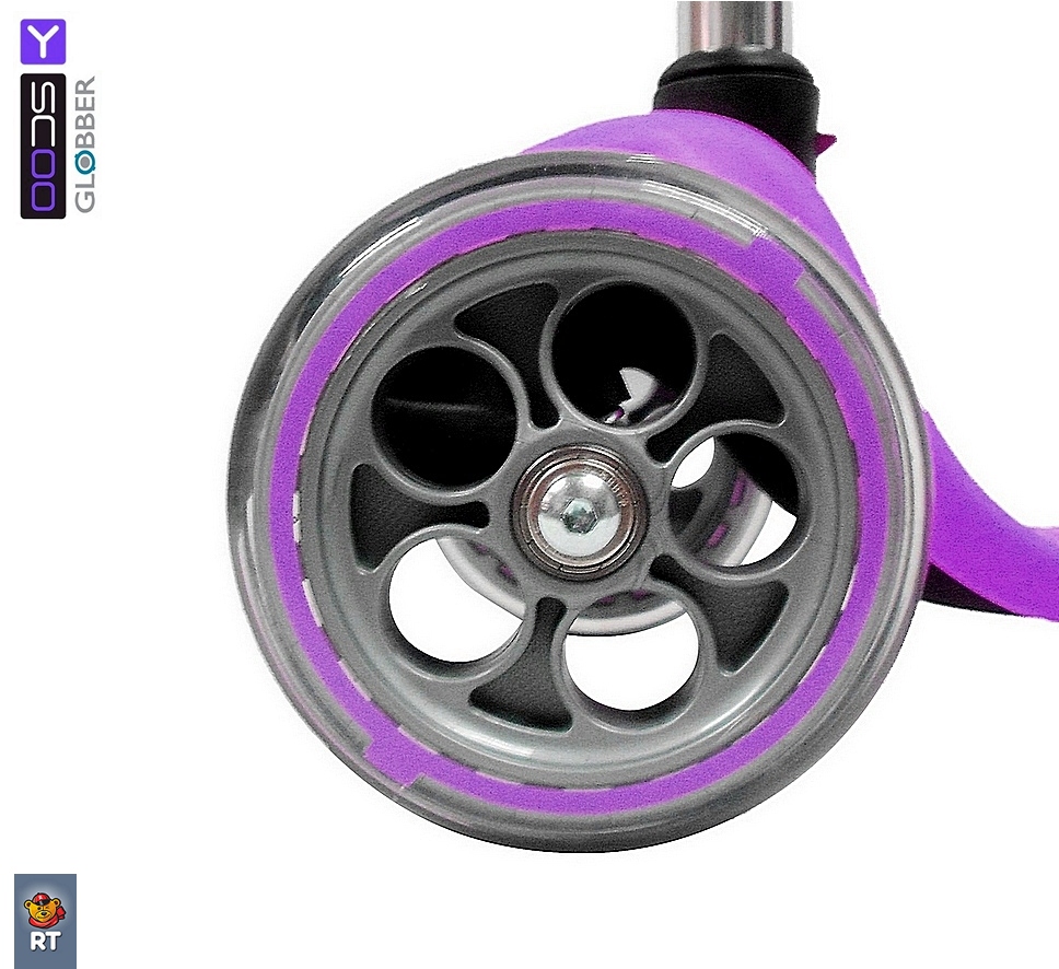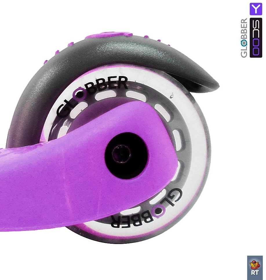Самокат y-scoo rt globber my free fixed purple с блокировкой колес. Встречайте новинку 2016 от Y-SCOO- Globber My Free FIXED с блокировкой передних колес. Очень дорогое черное матовое покрытие на ручке самоката с красивыми буквами Globber. Материал колес - полый, новая форма и цвет дисков -теперь от них невозможно оторвать взгляд. Рисунок дисков мы назвали пять планет. Колеса могут быть черными или прозрачными. Этот инновационный самокат с глобальным подходом к созданию самоката, идеально подходит для развития ребенка. Поэтому он и получил название Globber. Он глобален еще в том, что растет вместе с Вашим ребенком от 2 до 6 лет. Новая концепция в дизайне 3-х колесного самоката. Новая концепция в управлении. Заблокируйте 2 передних колеса простой кнопкой, чтобы малыш не смог завалиться на бок. Это уникальная находка наших инженеров- она поможет любому малышу в процессе обучения катанию на самокате. С этой инновационной функцией замка Ваш ребенок не упадет с самоката при обучению езде. А устойчивость самоката придаст малышу дополнительную уверенность. Он легко и бесстрашно будет осваивать самокат. Если Вы ищите первый самокат для своего малыша- нет самоката лучше Globber. Уникальная разработка платформы с выступающими бортиками по краям не даст ножке малыша соскользнуть с платформы. Мы также тщательно продумали форму платформы, на которой ноги малыша не будут уставать. Мы укрепили платформу тонкой и прочной стальной пластиной. Теперь малыш может прыгать на самокате –он выдержит любую нагрузку. Платформа имеет антискользящую поверхность. 2 передних колеса диаметром 121мм, и 1 заднее колесо диаметром 80 мм изготовлены из высококачественного полиуретана PU HQ (high quality)с нейлоновым наполнителем. Материал колеса HQ имеет высокую степень отскока. Высокоточные и скоростные подшипники ABEC 5 608ZZ. Алюминиевая ручка не меняется по высоте. Инновация - Безопасность обучения:Единственная в мире запатентованная система блокировки передних колес. Часто дети , которые только обучаются езде на самокатах с такой системой- наклон вправо- поворот вправо, наклон ручки влево- поворот влево, не умея еще уверенно держать равновесие, заваливаются на бок. Инженеры творческой мысли создали инновационную систему блокировки колес. Таким образом, чтобы помочь ребенку сначала освоить самокат , Вы сможете заблокировать колеса ( нажать на кнопку сверху панели самоката), и малыш спокойно может сначала учиться ездить только вперед. А потом, разблокировав колеса (нажать на красную кнопку под самокатом), Вы можете показать и научить малыша поворачивать, не боясь, что он упадет на бок. Это очень безопасно и легко при первых уроках обучению на самокате. Эргономика ручек на руле:Эргономичные прорезиненные ручки из эластичного двухкомпонентного материала с добавлением латекса необыкновенной формы. Впервые для большего комфорта мы удлинили ручки. Эргономика 10 баллов. Комфорт и большая износостойкость. Рулевое управление с усилителем:Продольные оси вращения (опоры передних колес) смонтированы на шарикоподшипниках для облегчения рулевого управления. Безопасность и долговечность:Более длинный тормоз для быстрой и безопасной остановки. Мы продумали покрытие заднего колеса- теперь торможение происходит быстрее . А колесу не страшна никакая деформация. Комфорт в использовании:Низкая платформа для большей устойч