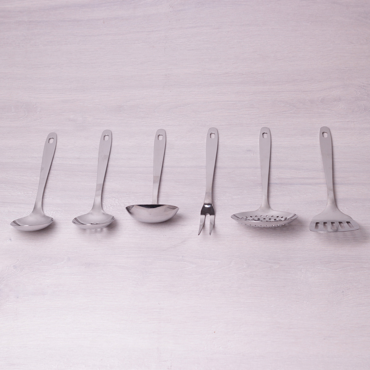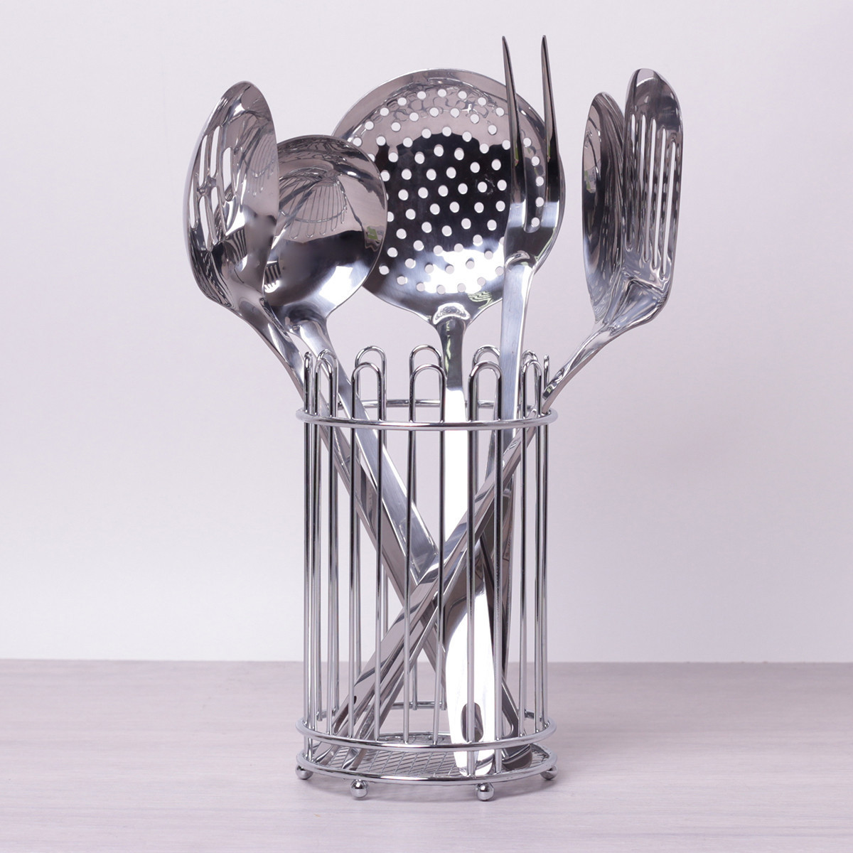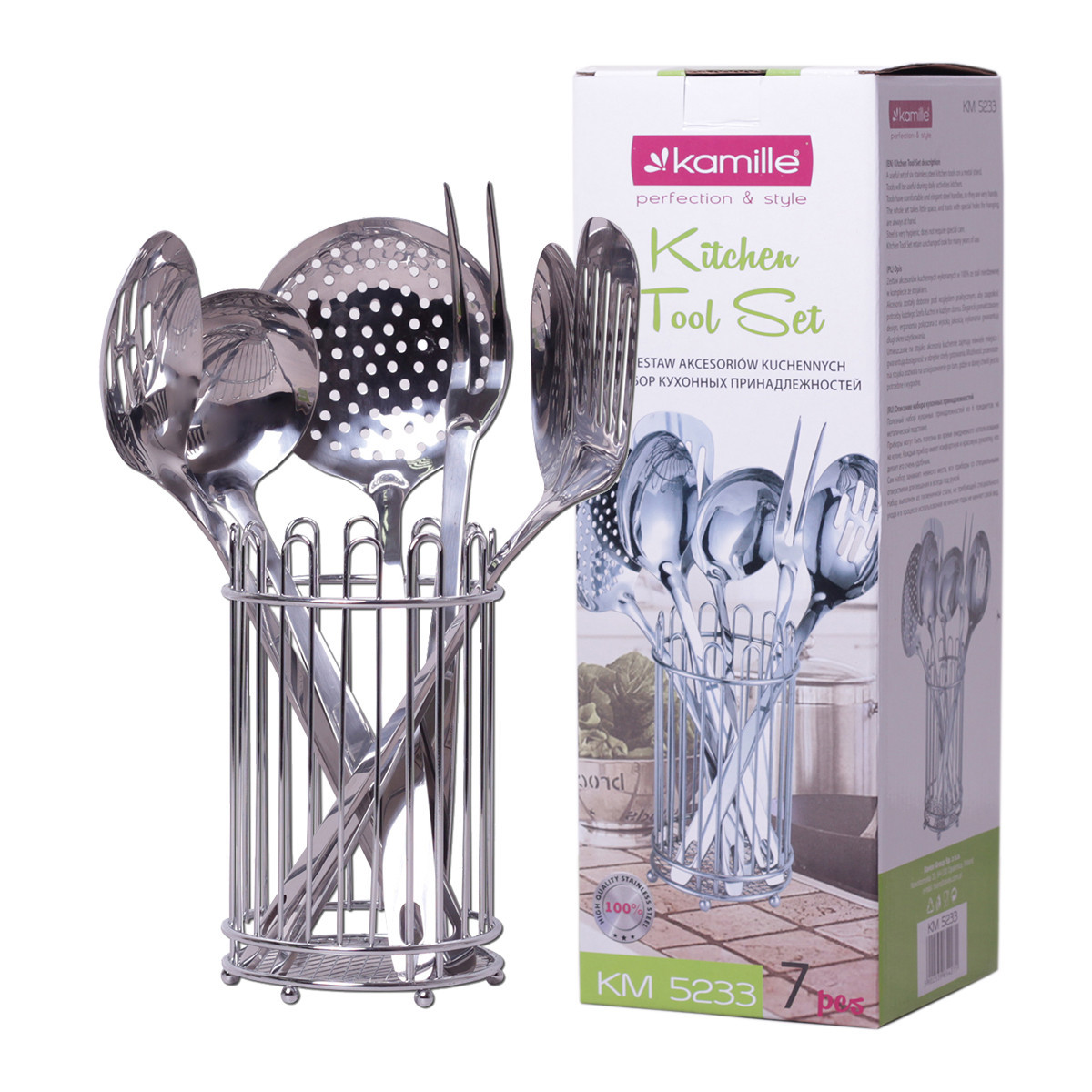 Набор кухонных принадлежностей 7 предметов kamille км-5233 из нержавеющей . Бренд: Kamille Описание: Кухонные принадлежности Kamille – это надежность, практичность и неповторимый дизайн. Кухонные принадлежности выполнены из высококачественной нержавеющей стали с применением современных технологий производства и абсолютно безопасны для здоровья человека. Имея у себя в арсенале такие кухонные принадлежности, Вы больше не будете беспокоится, что у Вас нет необходимого прибора, а приготовление блюд будет приносить только удовольствие. Набор кухонных принадлежностей из нержавеющей стали Kamille KM-5233 Материал: нержавеющая сталь Комплектация набора: половник 28 см шумовка 32 см лопатка с прорезями 32 см ложка поварская 31 см ложка поварская с отверстиями 31 см вилка для мяса 31 см подставка Ø11х18 см Особенности: стильный современный дизайн удобство и практичность в использовании зеркальная полировка ручки оснащены петлями для подвешивания можно мыть в посудомоечной машине