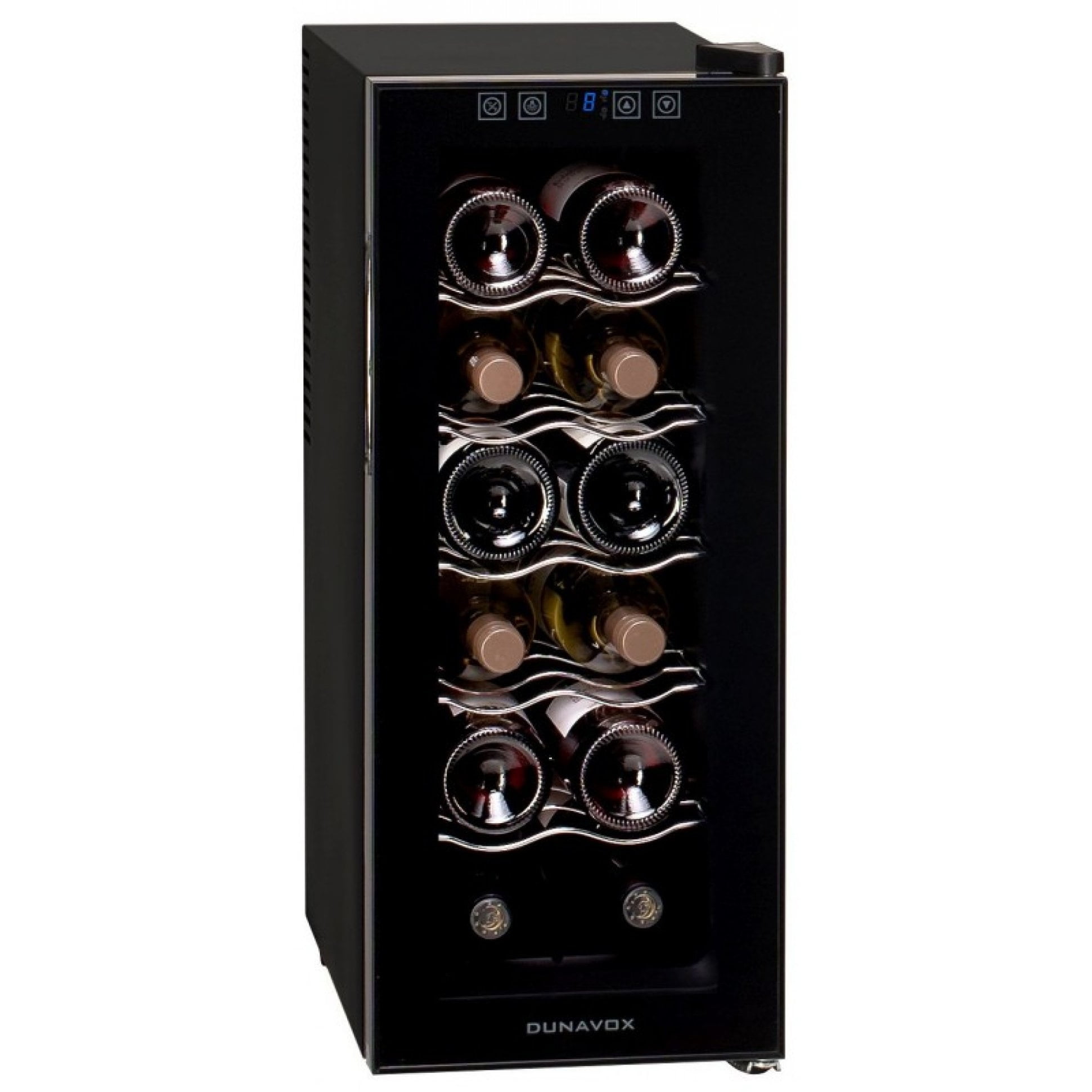 Винный шкаф dunavox thermo dat-12.33c, товары для загородного дома. Небольшой и вместительный термоэлектрический винный шкаф DAT-12.33C для дома вмещает в себя 12 бутылок и имеет одну зону охлаждения. Винный шкаф предназначен для установки на столешницу или стол. Встраивать его нельзя, так как термоэлектрические элементы чувствительны к перегреву и установка его в нишу крайне нежелательна, также не рекомендуется размещать винный шкаф на подоконнике, где он будет подвергаться воздействию солнечных лучей. Функциональные возможности: - Винный холодильник Dunavox DAT-12.33C чувствителен к качеству охлаждения, поэтому не рекомендуется устанавливать его под лучами солнца или рядом с нагревательными приборами. - Дверца шкафа выполнена из тонированного стекла и установлена в пластиковую раму в тон корпуса. - Удобная сенсорная панель управления обеспечивает простую и быструю установку необходимой температуры. - Внутренний вентилятор способствует равномерному распределению температуры по всему объему шкафа. - Дверь не перевешивается (петли справа). - Внутреннее освещение (светодиод синего цвета). nbsp Тип охлаждения Термоэлектрический Тип установки Отдельностоящий Размеры шкафа, см 590х252х515 Количество зон Одна Объем, Л 33