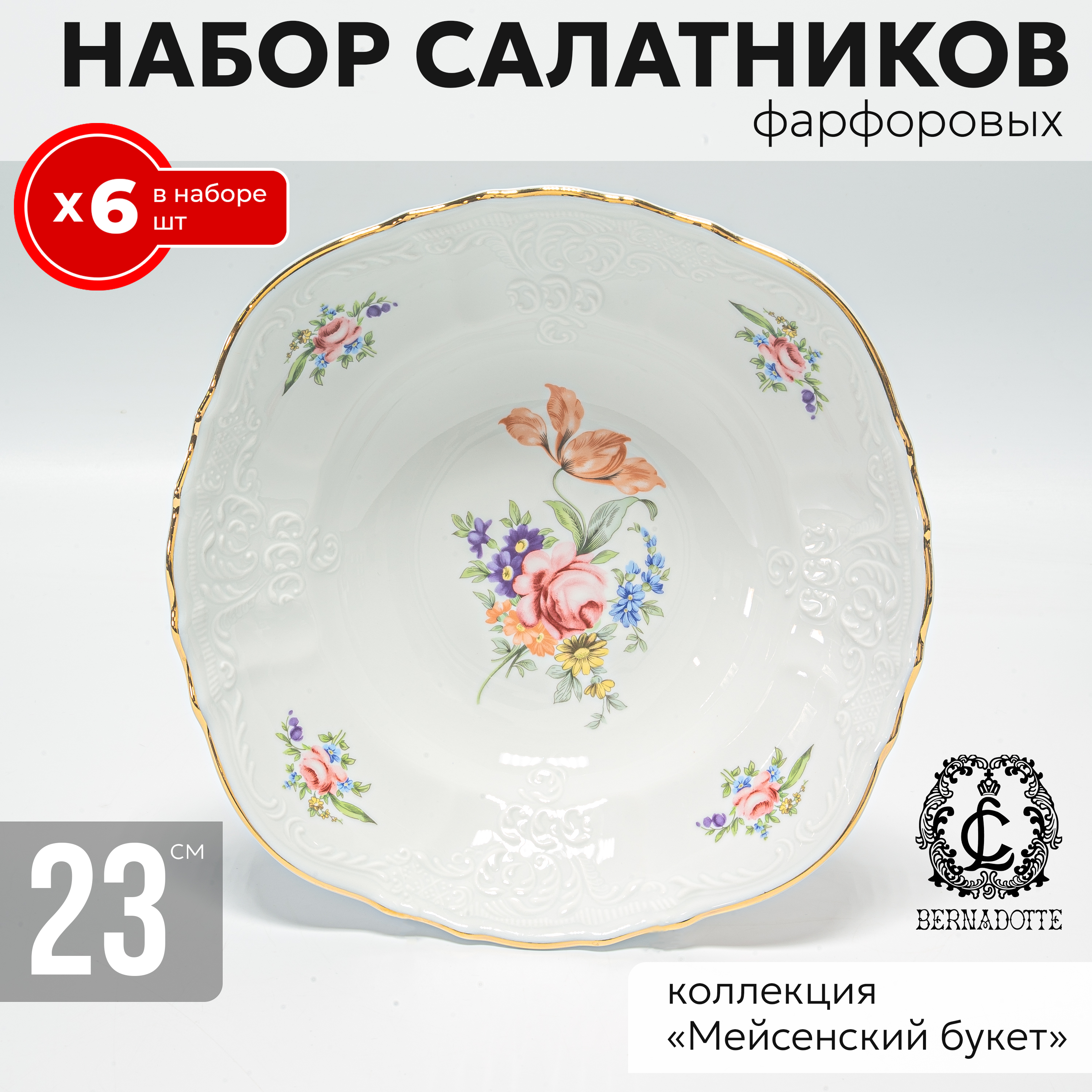 Набор салатников 6 шт круглых 23 см Bernadotte, декор мейсенский букет