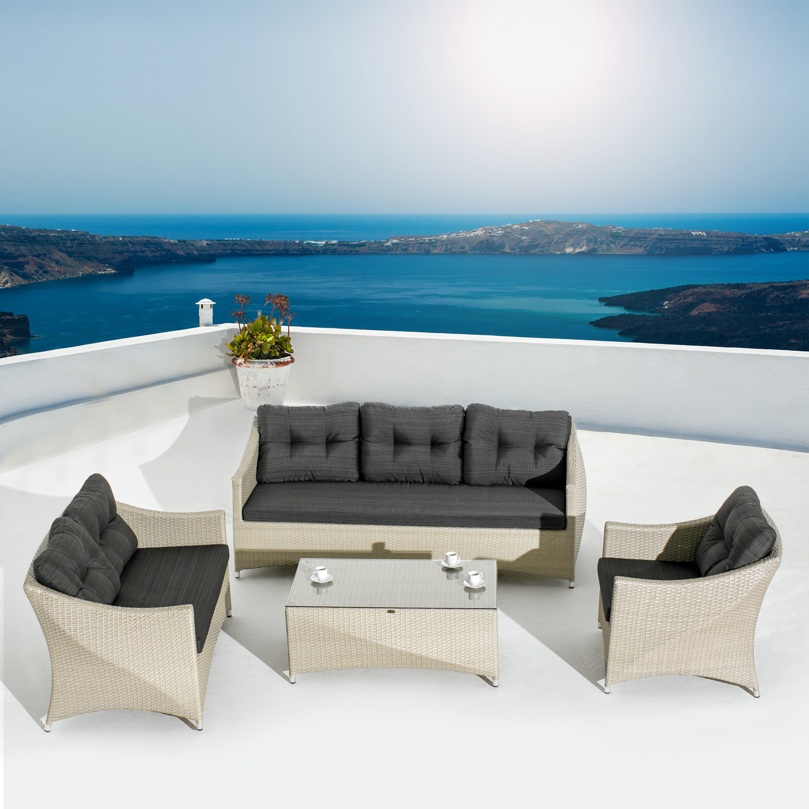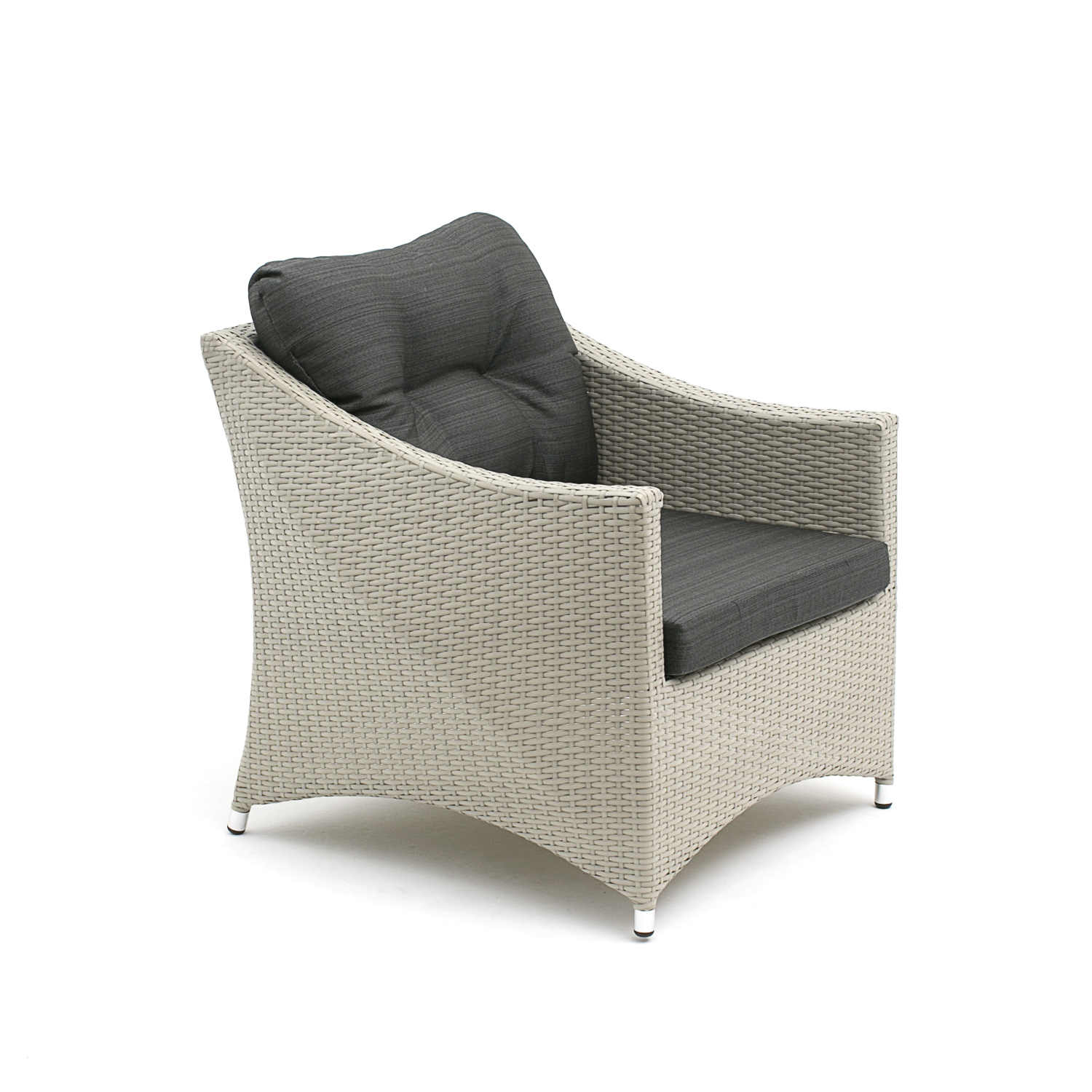 Комплект мебели из ротанга mi casa avila seis, садовая мебель. Дизайнерская лаунж-зона из новой белой коллекции. Основания в стиле волна. Плоское плетение. Всепогодная алюминиевая рама с покрытием Procolor. Подушки из темно-серой влаго-отталкивающей ткани в комплекте. Диван, см 190x80x78, 130x68x78 Кресло, см 75x68x78 Журнальный стол, см 100x60x46 Материал каркаса Всепогодный алюминий Материал изделия Искусственный ротанг