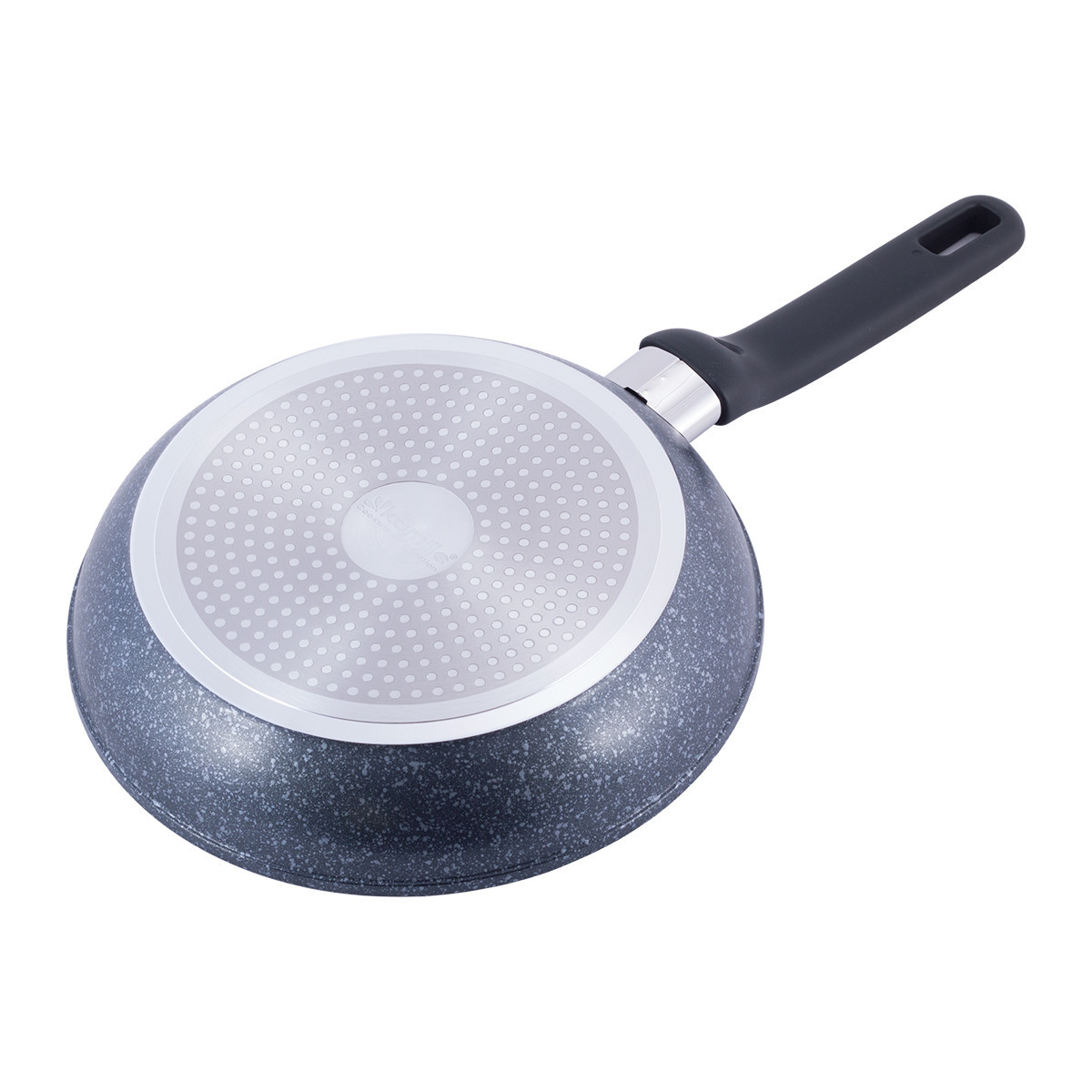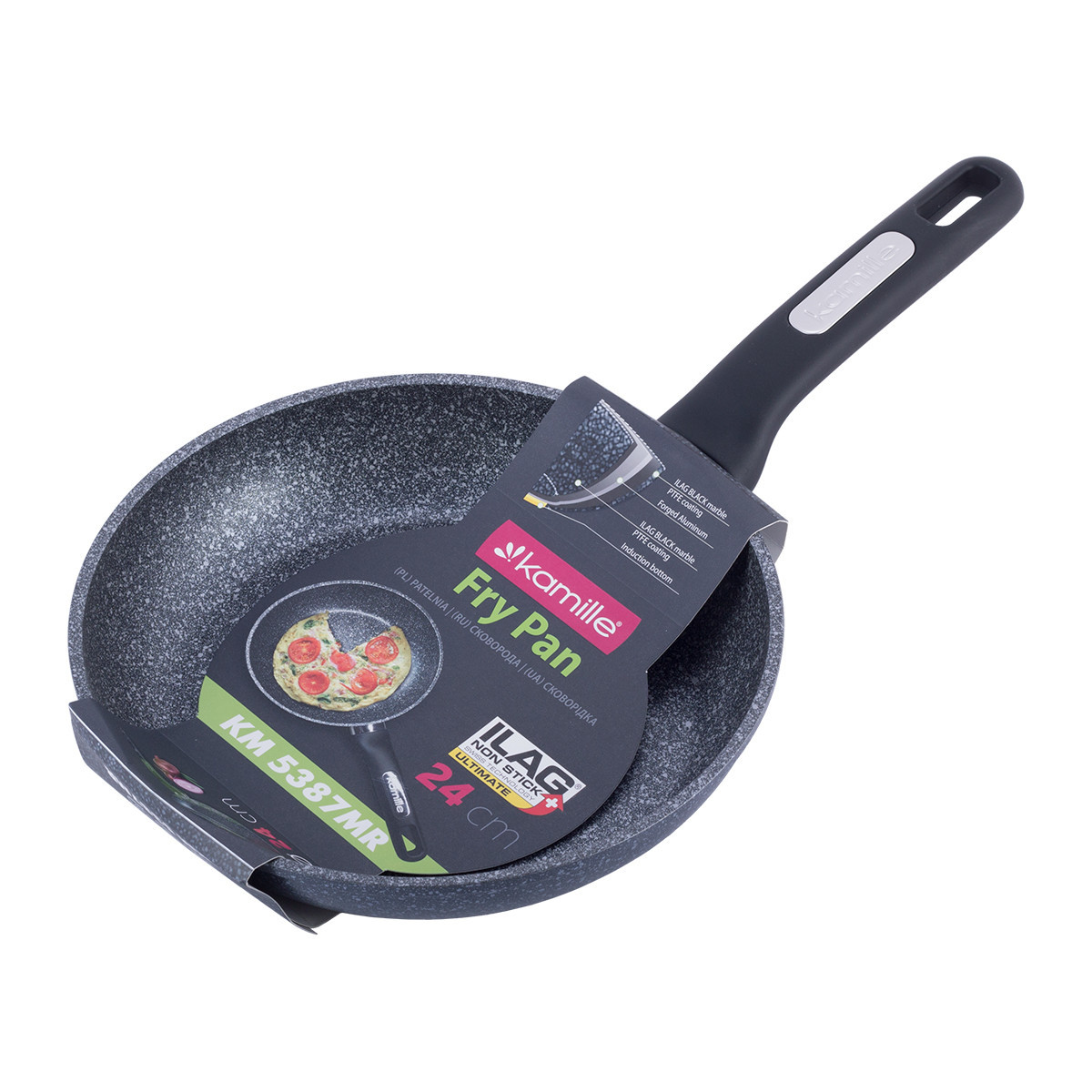 Сковорода 24 см kamille km-5387mr (24 см) с покрытием чёрный мрамор из ков. Бренд: Kamille Описание: Сковорода Kamille изготовлена из качественных материалов с использованием современных технологий производства. Такая сковорода имеет прекрасный внешний вид, оснащена утолщенным индукционным дном и отличается высокой прочностью и долговечностью в использовании. Благодаря своим эргономичным свойствам, изделие будет служить Вам очень долго и принесет только удовольствие от использования. Сковорода Kamille KM-5387MR (24 см.) с антипригарным покрытием черный мрамор Материал: кованный алюминий. Материал ручки: бакелит c покрытием soft-touch. Диаметр: 24 см. Высота 5 см. Длина ручки: 18 см. Антипригарное покрытие: ILAG чёрный мрамор PTFE покрытие. Цвет: чёрный. Особенности: идеальна для интенсивного использования, устойчива к износу имеет утолщенное индукционное дно отличается высокой теплопроводимостью и распределением температуры, что обеспечивает быстрое нагревание и длительное удержание тепла внутри прочное антипригарное покрытие мрамор подходит для всех видов плит подходит для мытья в посудомоечной машине Уход: перед началом использования необходимо удалить с изделия все ярлыки и элементы упаковки, тщательно вымыть и просушить после каждого использования дождаться охлаждения изделия, затем тщательно вымыть и просушить не рекомендуется использовать абразивные моющие средства и металлические щетки Использование и правила безопасности: не подвергать резким изменениям температуры не оставлять пустой на огне избегать попадания пламени на ручку и боковые стенки не использовать острые металлические аксессуары