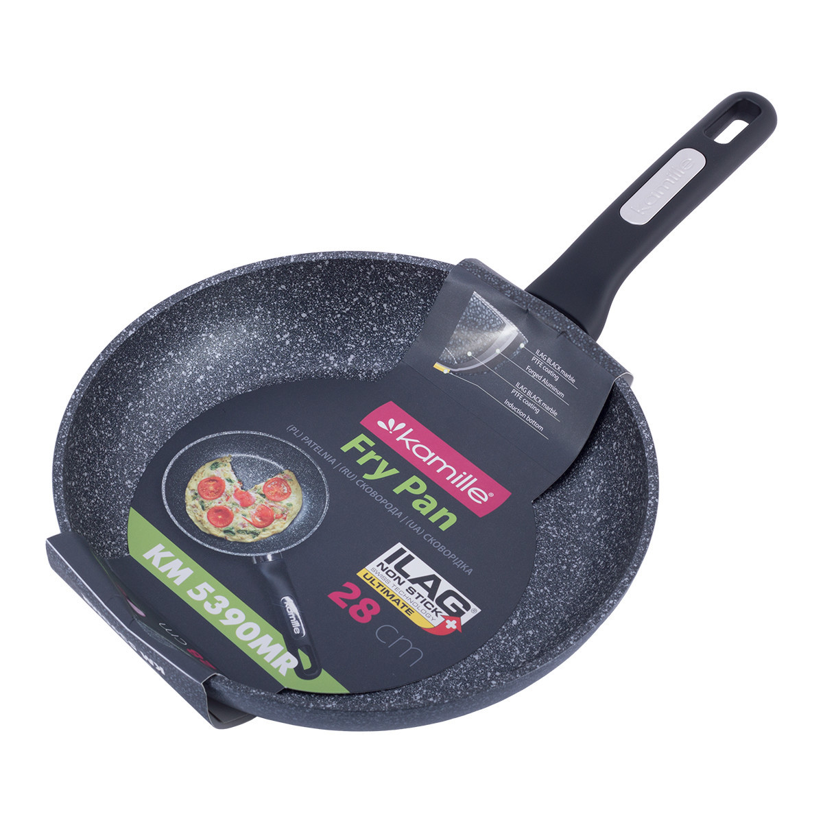 Сковорода 28 см kamille km-5390mr (28 см) с покрытием чёрный мрамор из ков. Бренд: Kamille Описание: Сковорода Kamille изготовлена из качественных материалов с использованием современных технологий производства. Такая сковорода имеет прекрасный внешний вид, оснащена утолщенным индукционным дном и отличается высокой прочностью и долговечностью в использовании. Благодаря своим эргономичным свойствам, изделие будет служить Вам очень долго и принесет только удовольствие от использования. Сковорода Kamille KM-5390MR (28 см.) с антипригарным покрытием черный мрамор Материал: кованный алюминий. Материал ручки: бакелит c покрытием soft-touch. Диаметр: 28 см. Высота 5,5 см. Длина ручки: 18 см. Антипригарное покрытие: ILAG чёрный мрамор PTFE покрытие. Цвет: чёрный. Особенности: идеальна для интенсивного использования, устойчива к износу имеет утолщенное индукционное дно отличается высокой теплопроводимостью и распределением температуры, что обеспечивает быстрое нагревание и длительное удержание тепла внутри прочное антипригарное покрытие мрамор подходит для всех видов плит подходит для мытья в посудомоечной машине Уход: перед началом использования необходимо удалить с изделия все ярлыки и элементы упаковки, тщательно вымыть и просушить после каждого использования дождаться охлаждения изделия, затем тщательно вымыть и просушить не рекомендуется использовать абразивные моющие средства и металлические щетки Использование и правила безопасности: не подвергать резким изменениям температуры не оставлять пустой на огне избегать попадания пламени на ручку и боковые стенки не использовать острые металлические аксессуары