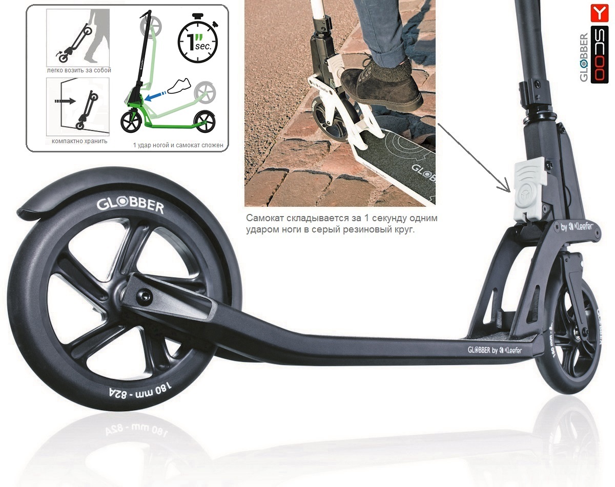 Самокат y-scoo globber my too 180 automatic by kleefer инновация-складной . Инновация года- фантастическая система складывания Kleefer. Международный патент. Впервые самоката оснащен поршневым механизмом, благодаря которому сложить самокат можно за 1 секунду. Вам не нужно ничего делать- самокат сложится сам. Теперь не нужно наклоняться- достаточно ударить ногой серую мягкую накладку и самокат сложится самостоятельно. Это находка неоценима при использовании самоката в городе, когда много людей и мало времени. Globber My TOO идеален для города. Вы не будете тратить время на складывание самоката, не будете задерживать людей при посадке и высадке из общественного транспорта. Вы не будете терять ни минуты. Только 1 секунду! My TOO имеет широкую и низкую платформу- Вы не будете высоко прыгать с самоката при разгоне. Вы легко сможете отталкиваться ногой и ставить на широкую платформу обе ноги. Эргономика- 10 баллов. Идеальная изогнутая форма руля позволяет почувствовать высшую степень комфорта. Ширина руля 48 см. Вы оцените удобство этой обтекаемой формы. Руль можно отрегулировать на 3 разные высоты: 100/94/89 см. Вы сможете настраивать руль как Вам будет удобно. Эта модель имеет 2 тормоза: ручной и ножной. Задний тормоз - длинный тормоз, который обволакивает колесо 180 мм. Для переднего тормоза используется ручка на руле как на велосипеде. Благодаря колесу 180 мм, твердость 82 А Вы почувствуете плавность хода и скоростного наката самоката. Большие колеса сделаны из высококачественного полиуретана и имеют хороший отскок. Подшипники ABEC 7. Фирменные ручки Globber выполнены из двойного материала и имеют идеальную эргономичную форму для рук. Над передним колесом- защитное крыло. В сложенном состоянии самокат легко везти за собой. Ширина деки: 150 мм. Высота деки: 70 мм. Максимальная нагрузка 100 кг. Рекомендуется для детей от 8 лет, и для взрослых ростом от 1, 45 м. . Прочие Торговая Марка Y-SCOO Globber ШтрихКод 3429324981906 Базовая единица шт Размер (см) длина платформы 82 см ширина 14 см, высота ручки 100/94/89 см, в сложенном виде 98х23 Артикул 00000005499 Вес (кг) 5. 7 Размер переднего колеса 180 мм Размеры в упаковке (см) 100х15х20 Вес в упаковке (кг) 6. 5 Пол универсальный Размер заднего колеса 180 мм Объем в упаковке 0. 03 Артикул2 Globber My TOO 180 черный Регулировка высоты руля есть Ручной тормоз есть Система быстрого складывания есть Бренд Y-SCOO Амортизатор нет Ремень для переноски нет Подножка есть Колеса полиуретан Количество колес 2 Тормоз задний ножной