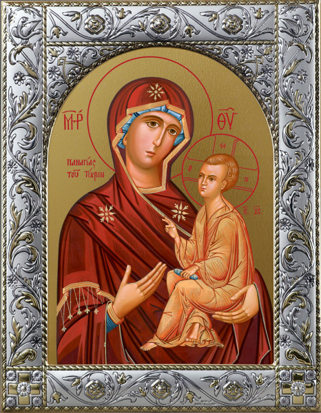Новинка. Рамка икон выполнена из металла, покрытого серебром. На окладе имеется штамп по европейскому стандарту. Каждое изделие изготавливается с использованием традиционной ручной обработки с использованием драгоценных металлов и высококачественных материалов, полученных по новейшим технологиям. MIRO SILVER- это новый металл, который придает покрытию поверхностную обработку, включающую в себя и большую стойкость к окисляющему слою чистого серебра 999,95%, по сравнению с обычными покрытиями. Иконография выполнена минеральными красками по золочению методом UV печати на деревянной доске или МДФ.