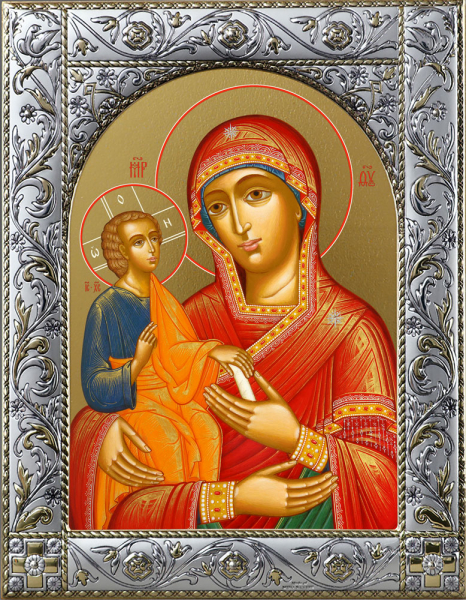 Новинка. Рамка икон выполнена из металла, покрытого серебром. На окладе имеется штамп по европейскому стандарту. Каждое изделие изготавливается с использованием традиционной ручной обработки с использованием драгоценных металлов и высококачественных материалов, полученных по новейшим технологиям. MIRO SILVER- это новый металл, который придает покрытию поверхностную обработку, включающую в себя и большую стойкость к окисляющему слою чистого серебра 999,95%, по сравнению с обычными покрытиями. Иконография выполнена минеральными красками по золочению методом UV печати на деревянной доске или МДФ.