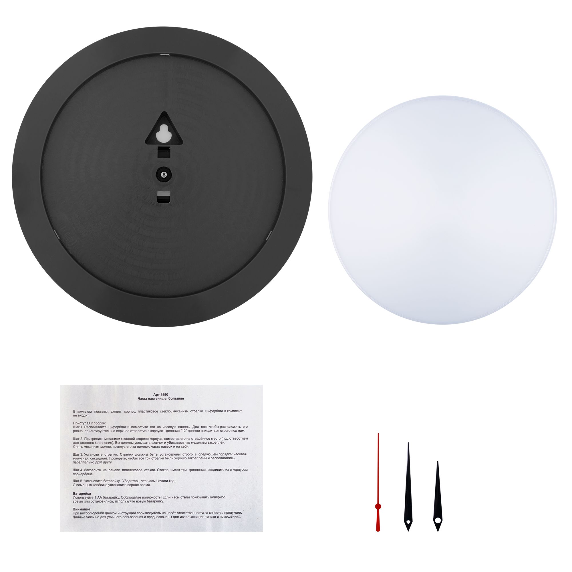 Часы настенные vivid large, черные. Размеры диаметр 30,5 см; ширина ободка 3 см; упаковка: 31х31х5 см Материал пластик Вес (1 шт.) 450 г Транспортная упаковка 43,0x32,0x32,0 см Вес 3,60 кг Объем упаковки 0,044 м? Количество в упаковке 8 шт. Виды нанесения MW1-Цифровой офсет Часы поставляются в разобранном виде: корпус, крышка, стрелки, механизм и индивидуальная упаковка - коробка. Часовая и минутная стрелки - черного цвета, секундная - красного цвета. Циферблат в комплект не входит, но его можно изготовить в индивидуальном дизайне методом полноцветной печати. Просто подготовьте макет согласно конструктору, напечатайте его на плотном картоне, вырежьте по контуру и аккуратно поместите в часы. Устройство работает на батарейке типа АА (1 шт.). Батарейка в комплект не входит! Гарантия на механизм 1 год.