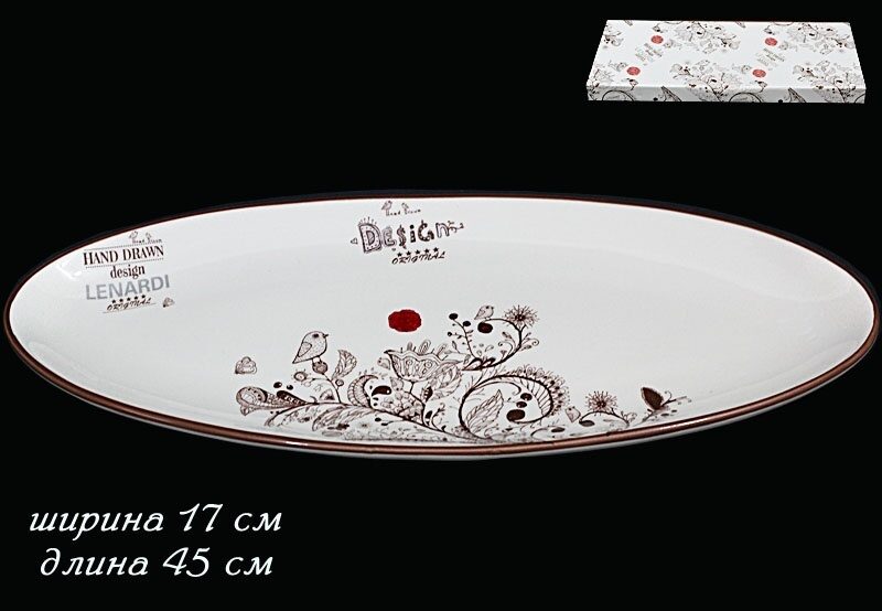Овальное блюдо46х17х3 см птичий дворик в подарочной упаковке lenardi. Овальное блюдо длина 46 см, ширина 17 см, высота 3 см Упаковано в подарочную коробку в дизайне Птичий дворик Коллекция керамической посуды выполнена в нашем эксклюзивном запатентованном дизайне Птичий дворик. В ассортименте полная сервировка стола и аксессуары для кухни. Керамика высокого качества, над глазурная деколь, эмаль молочного цвета в сочетании с шоколадного цвета дизайном. Керамическая серия прекрасно дополнит нашу коллекцию эмалированной посуды для приготовления Птичий дворик, что позволит собрать идеальную кухню в едином стильном дизайне. Материал: керамика Можно использовать в микроволновой печи и мыть в посудомоечной машине