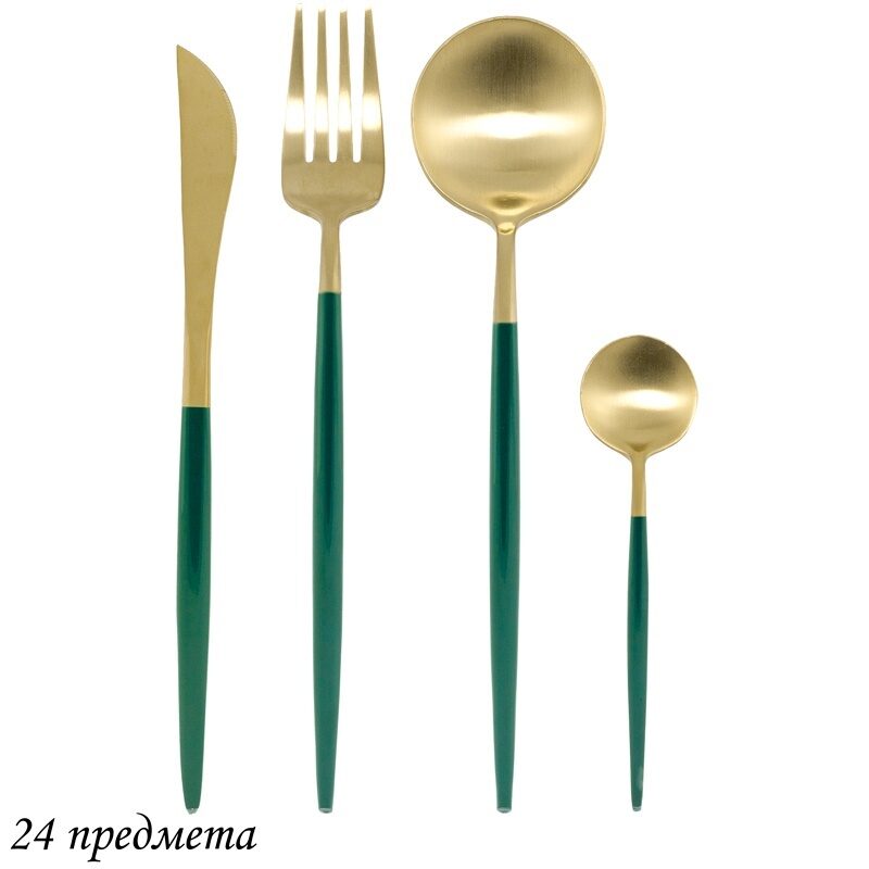Набор столовых приборов 24пр. vivid зеленые в подарочной упаковке lenardi. Коллекция столовых приборов Vivid изготовлена из нержавеющей стали 18/10, с гальваническим покрытием, эмитирующим золото. Тонкие и изящные они поражают воображение идеальной формой, яркими цветами и стильным дизайном. Ручка столовых приборов декорирована цветной матовой эмалью. Наполнение набора из 24 предметов: 6 шт. вилки 6шт. ножи 6 шт. чайные ложки 6 шт. столовые ложки Не рекомендуется мыть в посудомоечной посуда во избежание повреждения декоративного покрытия.