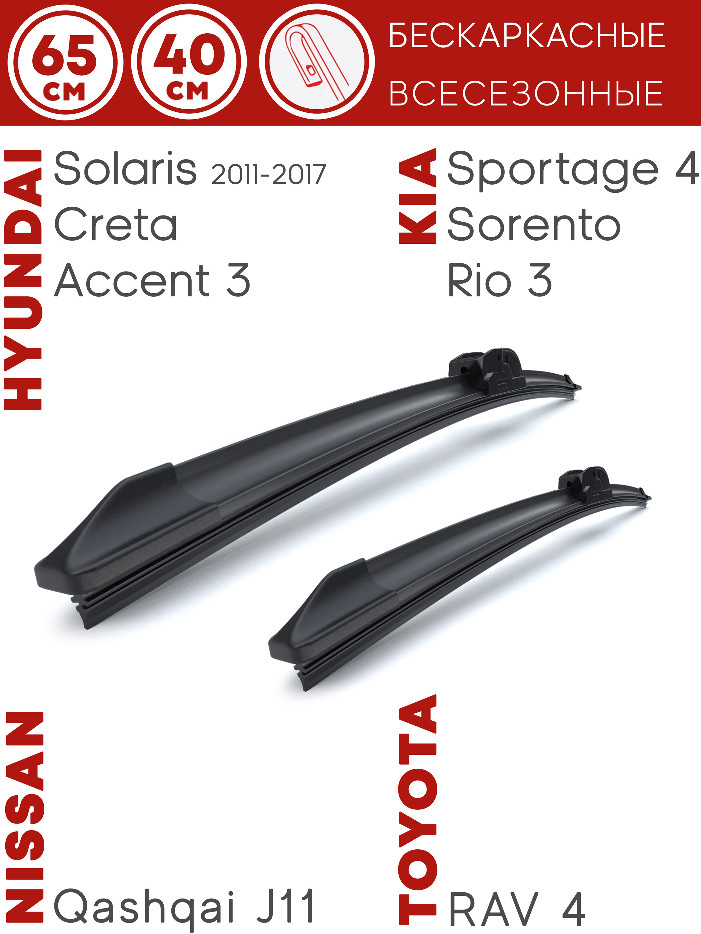 Щетки стеклоочистителя 650 мм, 400 мм, дворники автомобильные Применяется на: Hyundai Solaris 2011 - .. (Sedan [RB]; Hatchback; Sedan [RB], Restyling; Hatchback, Restyling) Nissan Murano 2008-2014 (Crossover [Z51], II; Cabrio [Z51], II) Kia Rio 2011 - 2017 (Sedan [UB] III; Hatchback [UB] III) Kia Rio 2017 - 2019 (Hatchback [UB] III Restyling ) Toyota Avensis 2001 - 2009 (Verso Minivan [M20/21]) Toyota Avensis 2009 - 2019 (Sedan [T27]; Universal [T27]; Sedan [T27], Restyling; Universal [T27], Restyling)