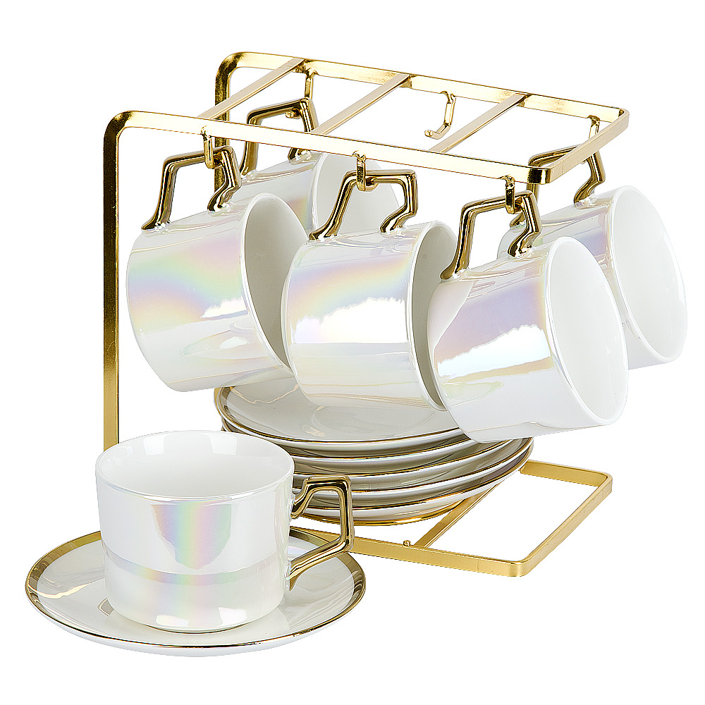 1шт чайный набор 13пр pearl (6 персон) v=200мл на подставке. Чайный набор 13пр Pearl (6 персон) v=200мл. на подставке (подарочная упаковка) Коллекция Pearl – природная красота и нежность жемчуга перенесенная на фарфоровую посуду. В коллекции широкий выбор изделий для сервировки чайного стола. Посуду рекомендуется мыть вручную, с использованием мягких моющих средств. Упакована в индивидуальную подарочную коробку. Материал: Фарфор Упаковка: Цветная коробка Цвет основной: Перламутровый Комплектация: Чашка - 6 шт блюдце - 6 шт, подставка - 1 шт Использование в СВЧ: Нет Мытье в посудомоечной машине: Нет Рисунок: Без рисунка Форма: Фигурная  развернуть описание ▼
