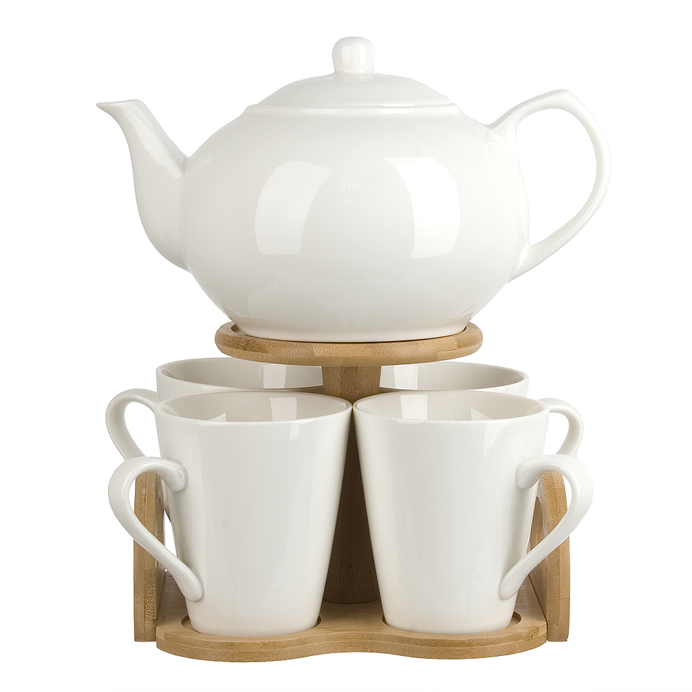 Набор на бамбуковой подставке (чайник v=1200мл.+4 кружки v=300мл.) naturel. Набор на бамбуковой подставке (чайник v=1200мл. #43;4 кружки v=300мл.) Naturel (подарочная упаковка) Коллекция Naturel поражает своим оригинальным сочетанием эстетики форм и видов посуды. В нее входят масленки, наборы для специй, банки для хранения и многое другое. Универсальность исполнения и функциональность делают эту коллекцию еще более привлекательной. Стильная и практичная посуда станет эффектным украшением вашего интерьера и приятным дополнением к вашему обеденному столу. Неповторимое очарование сочетания элементов натурального бамбука и фарфора создаст прекрасное настроение в любое время года. Коллекция Naturel подходит для любого стиля интерьера и добавит нотку природной красоты в ваш дом. Изделия коллекции можно мыть в посудомоечной машине и использовать в микроволновой печи, за исключением элементов из бамбука. Таким образом, они удобны и практичны в использовании. Коллекция Naturel упакована в яркую коробку, что делает ее прекрасным подарком для друзей и близких. Не упустите возможность приобрести эту прекрасную посуду и добавить нотку природной красоты в свой дом. Материал: Фарфор, бамбук Упаковка: Цветная коробка Цвет основной: Белый Комплектация: Чайник - 1 шт, кружка - 4 шт, подставка - 1 шт Использование в СВЧ: Да Мытье в посудомоечной машине: Да Рисунок: Без рисунка  развернуть описание ▼