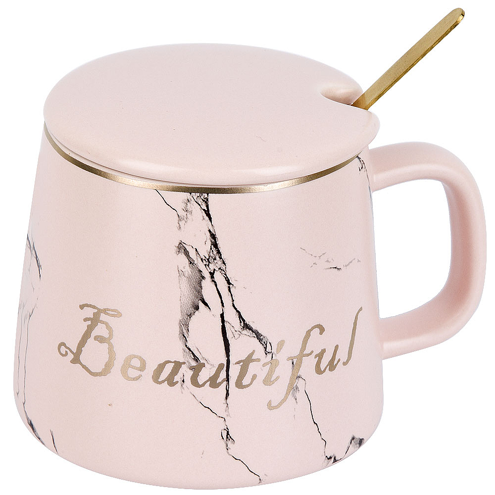 Кружка фарфоровая с крышкой и ложкой Beautiful (розовая) V=400 мл (подароч