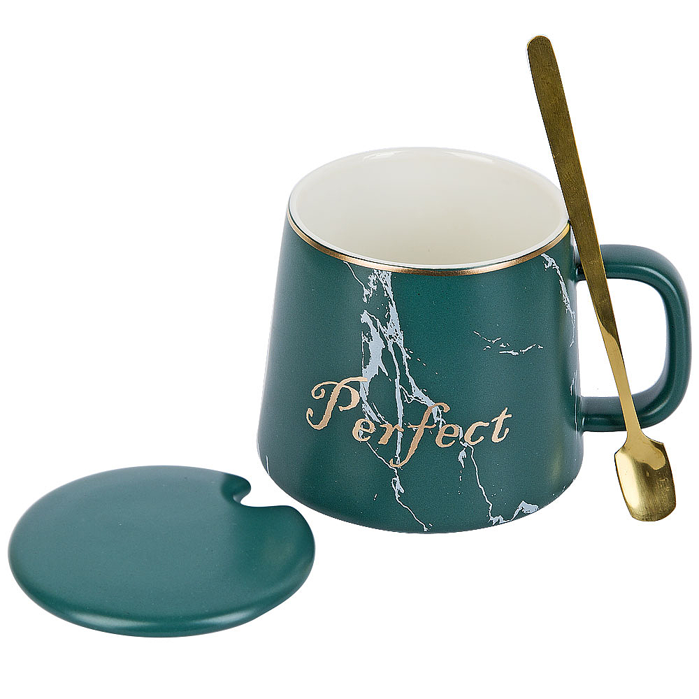 Кружка фарфоровая с крышкой и ложкой Perfect (зеленая) v=400 мл (подарочная упаковка)