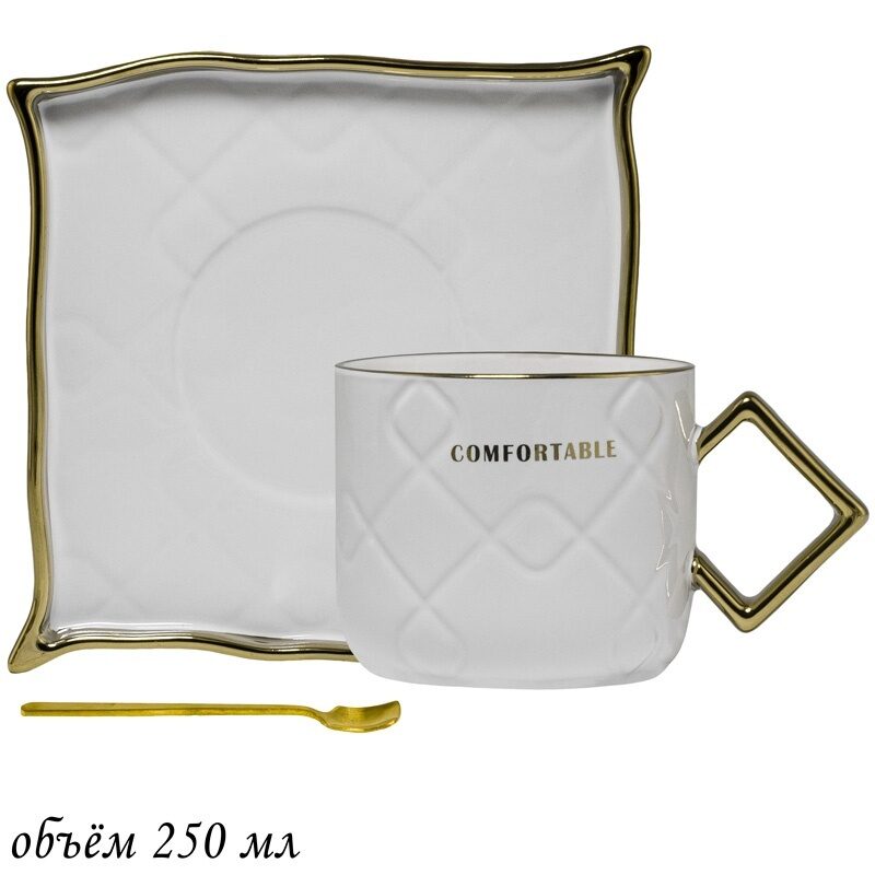 Чайная пара Доляна «Зефир», 350 мл, керамика, белая 4шт Чашка 250 мл с блюдцем и ложкой в подарочной упаковке Lenardi