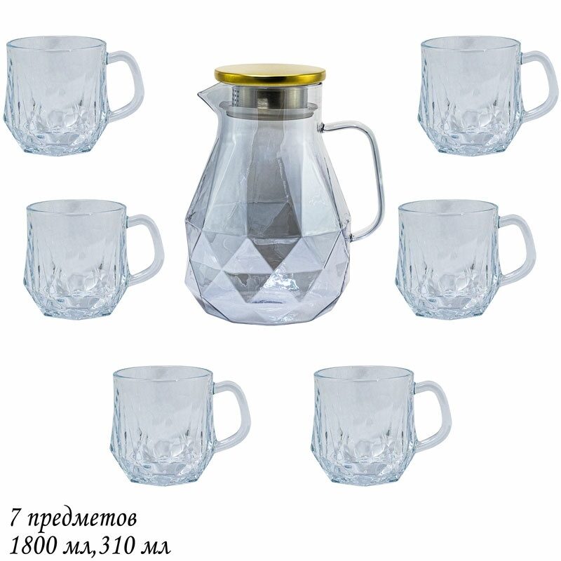 Набор: кувшин-заварник 1,9 л и 6 кружек 350 мл голубой, в подарочной упаковке lenardi. Набор: кувшин-заварник 1,9 л и 6 кружек 350 мл Кувшин-заварник с крышкой можно использовать как для горячих, так и холодных напитков. Выполнен из жаропрочного термостойкого боросиликатного стекла, его можно нагревать на газовой, электрической плите и кипятить в нём воду, подогревать напитки. Кувшин-заваник с золотой крышкой и фильтром. Чайник кувшин можно использовать для заваривания чая, трав. Материал: боросиликатное стекло Нельзя мыть в посудомоечной машине. Мыть мягкой губкой без абразивных средств.  развернуть описание ▼