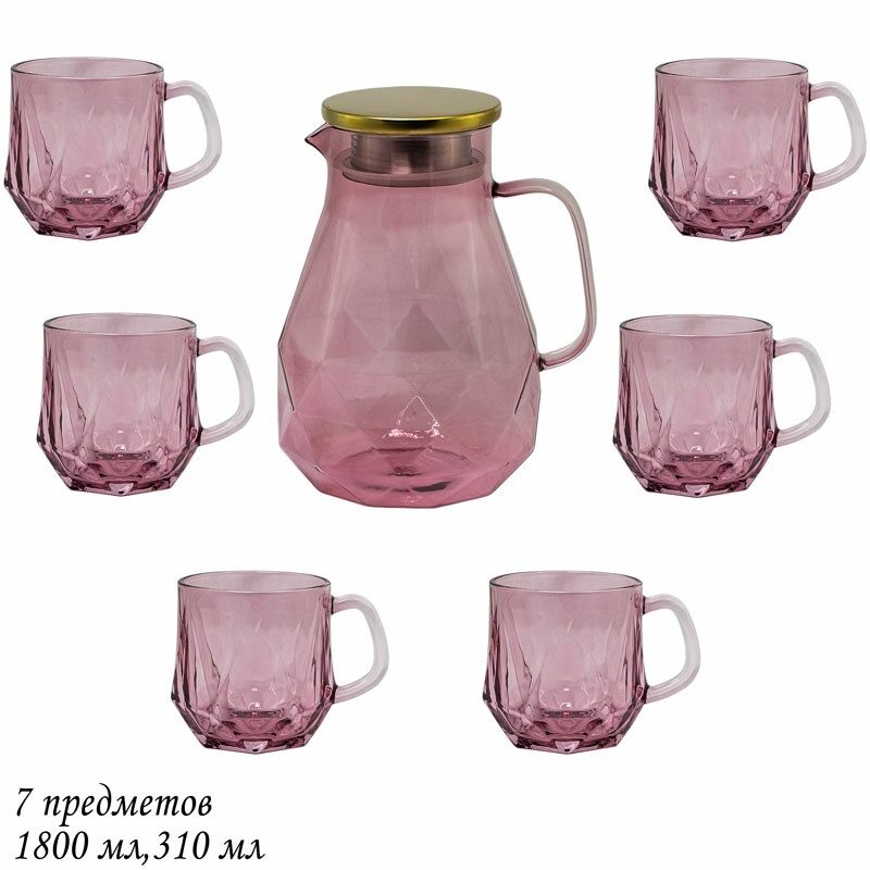 Набор: кувшин-заварник 1,9 л и 6 кружек 350 мл розовый, в подарочной упаковке lenardi. Набор: кувшин-заварник 1,9 л и 6 кружек 350 мл Кувшин-заварник с крышкой можно использовать как для горячих, так и холодных напитков. Выполнен из жаропрочного термостойкого боросиликатного стекла, его можно нагревать на газовой, электрической плите и кипятить в нём воду, подогревать напитки. Кувшин-заваник с золотой крышкой и фильтром. Чайник кувшин можно использовать для заваривания чая, трав. Материал: боросиликатное стекло Нельзя мыть в посудомоечной машине. Мыть мягкой губкой без абразивных средств.  развернуть описание ▼