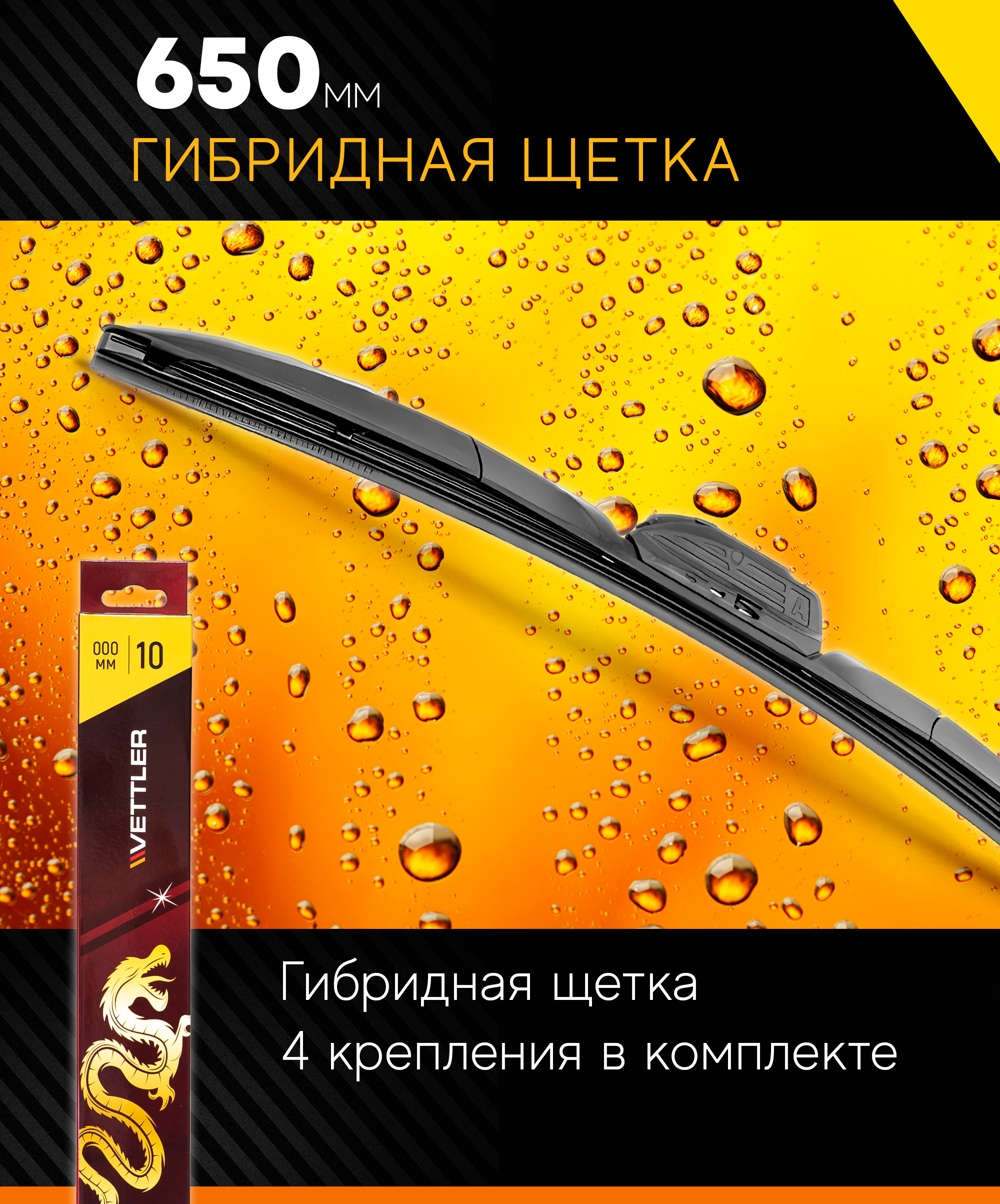 Щетка стеклоочистителя гибридная 650 мм (26) vettler dragon. Гибридные щетки стеклоочистителя Vettler серии Dragon обеспечивают эффективную очистку лобового стекла автомобиля в широком диапазоне температур и при любых погодных условиях. Чистящая лента щетки изготовлена из натурального каучука и имеет графитовое покрытие, способствующее бесшумной работе и качественному скольжению по поверхности стекла. Универсальные адаптеры обеспечивают совместимость щеток стеклоочистителя Vettler Dragon с креплениями большинства автомобилей, а также их простую и быструю установку. Наличие спойлера из ABS-пластика способствует улучшению аэродинамических характеристик и плотному прилеганию чистящей кромки к стеклу даже на высокой скорости. Гибридные щетки стеклоочистителей Vettler Dragon доступны в следующих размерах: 350 мм (14") 380 мм (15") 400 мм (16") 430 мм (17") 450 мм (18") 480 мм (19") 500 мм (20") 530 мм (21") 550 мм (22") 600 мм (24") 650 мм (26") 700 мм (28")