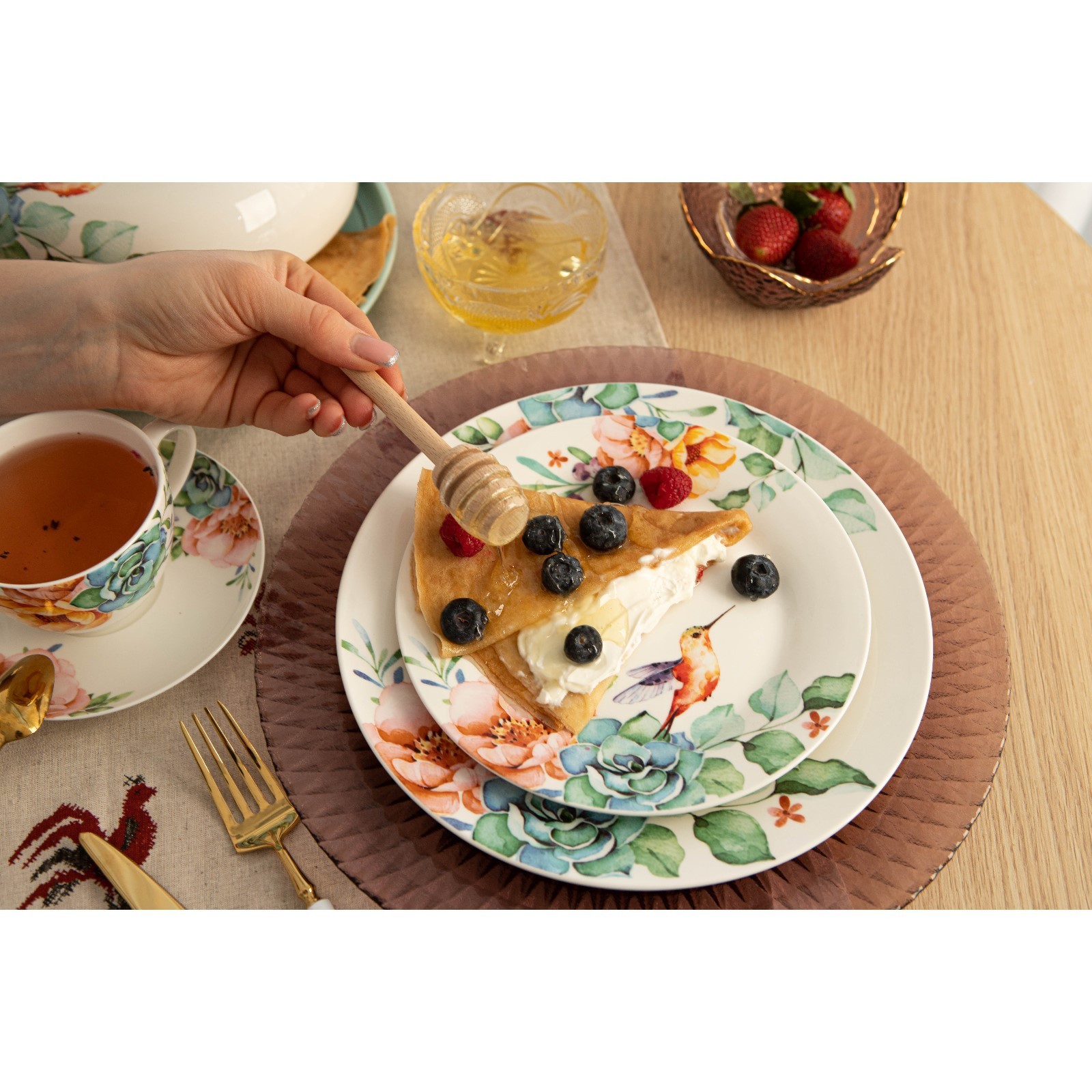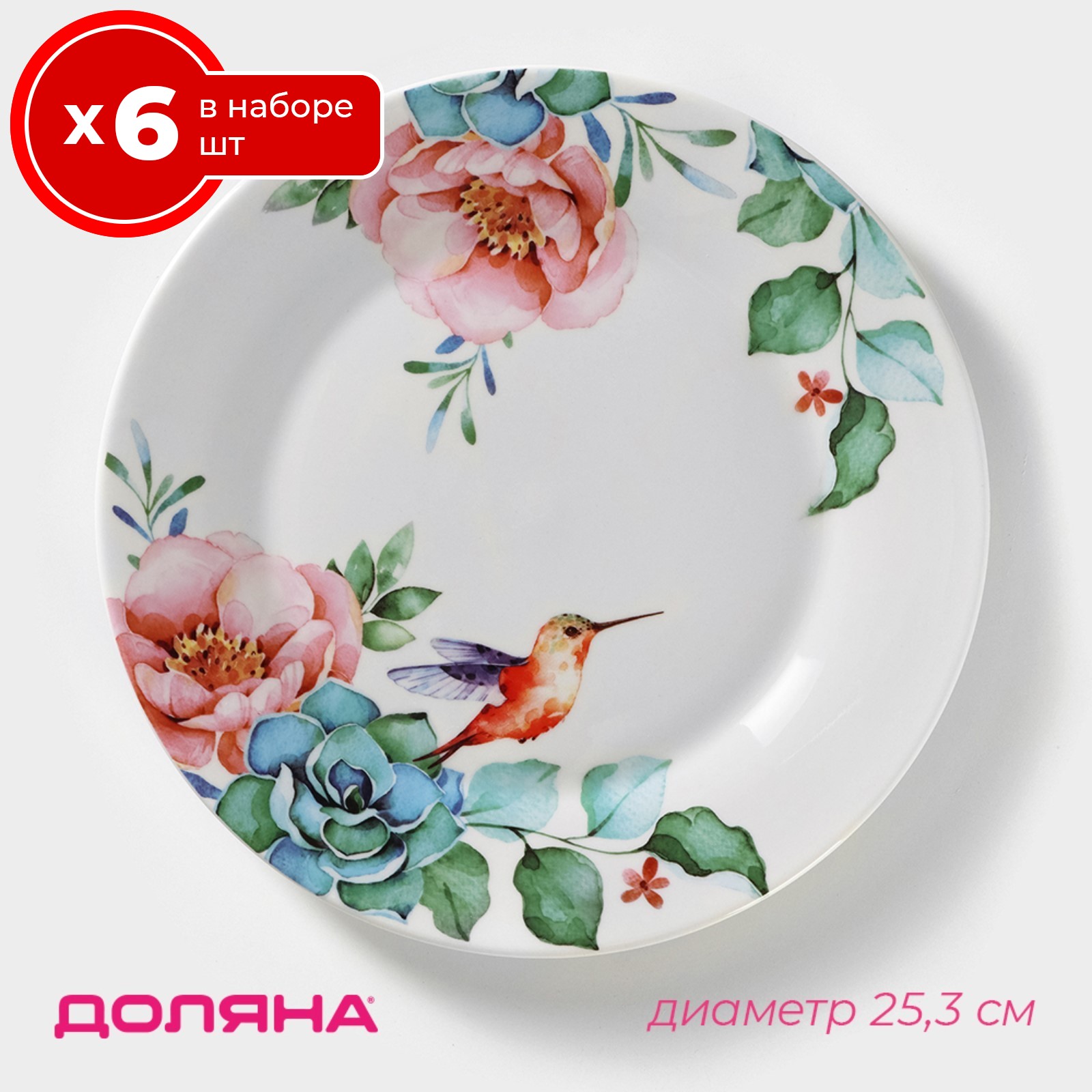 Набор тарелок 6 шт обеденных столовых 25.5 см на 6 персон доляна пташка, новый костяной фарфор, мелкие. Тарелка Доляна «Пташка» изготовлена из качественного костяного фарфора. Такая посуда не только тоньше, но и заметно легче, чем аналогичные изделия из обычного фарфора. Благодаря оригинальному дизайну изделие легко украсит вашу кухню, а также прекрасно подойдёт в качестве подарка. Тарелка выполнена в приятных тонах, что позволит вписать её практически в любой интерьер. Можно использовать в посудомоечной машине и СВЧ-печи. Цвет: Белый Форма: Круглая Диаметр, см: 25.3 В наборе, шт.: 1 Тематика: Цветочно-растительная Тематика: Птицы Материал: Фарфор (Новый костяной фарфор) Вид тарелки: Плоская Можно мыть в посудомоечной машине: Да Можно использовать в СВЧ-печи: Да Текстура: Гладкая Особенности: Без особенностей Матовая поверхность: Нет Для горячего: Да  развернуть описание ▼