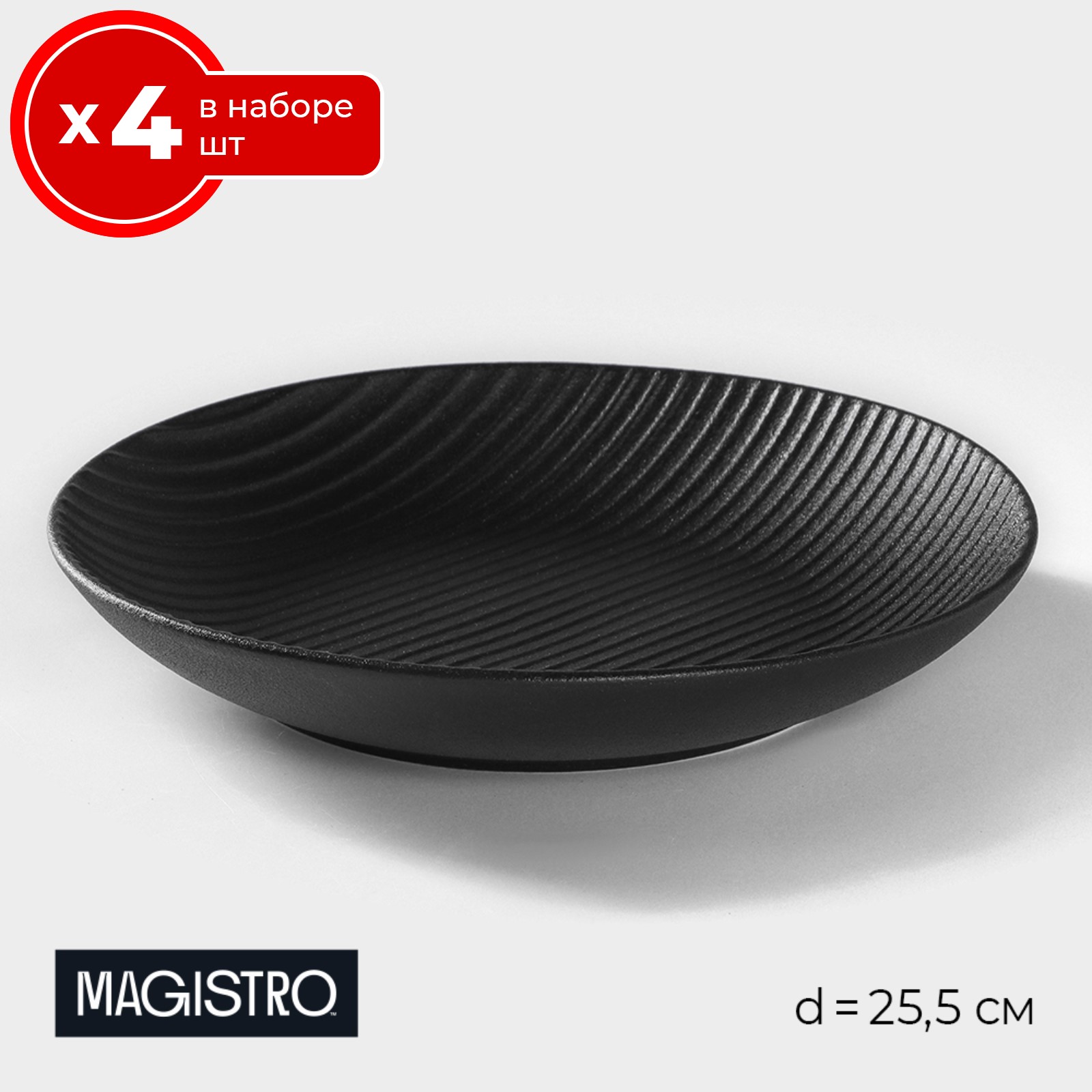 Набор тарелок 4 шт обеденных столовых 25.5 см на 4 персоны magistro line, фарфор, мелкие. Серия Line от торговой марки Magistro являются настоящим классическим эталоном. Чёткие формы, рельефная текстура и классические цвета сочетаются воедино и создают особенный вид изделиям. Вся посуда изготовлена из качественного фарфора, отличается прочностью и устойчивостью к резким перепадам температур. Посуда Line подходит как для праздничной, так и для ежедневной сервировки. Можно мыть в ПММ и использовать в СВЧ. Цвет: Чёрный Форма: Круглая Диаметр, см: 25.5 В наборе, шт.: 1 Тематика: Однотонная Материал: Фарфор Вид тарелки: Плоская Можно мыть в посудомоечной машине: Да Можно использовать в СВЧ-печи: Да Текстура: С рельефом Особенности: Без особенностей Матовая поверхность: Да Для горячего: Да  развернуть описание ▼