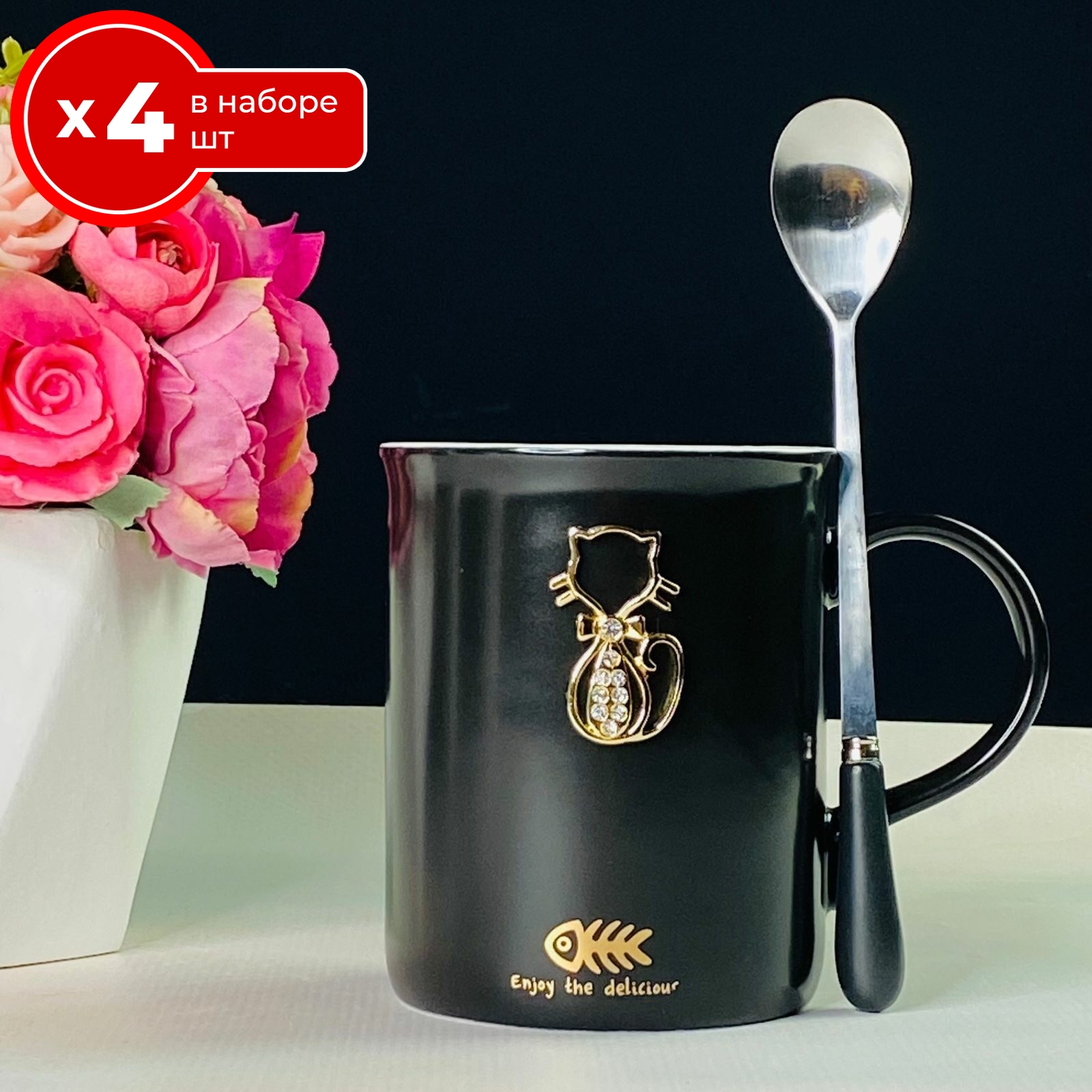Набор из 4 кружек Lenardi кошка 350 мл, фарфор, чашки для чая и кофе 4 шт