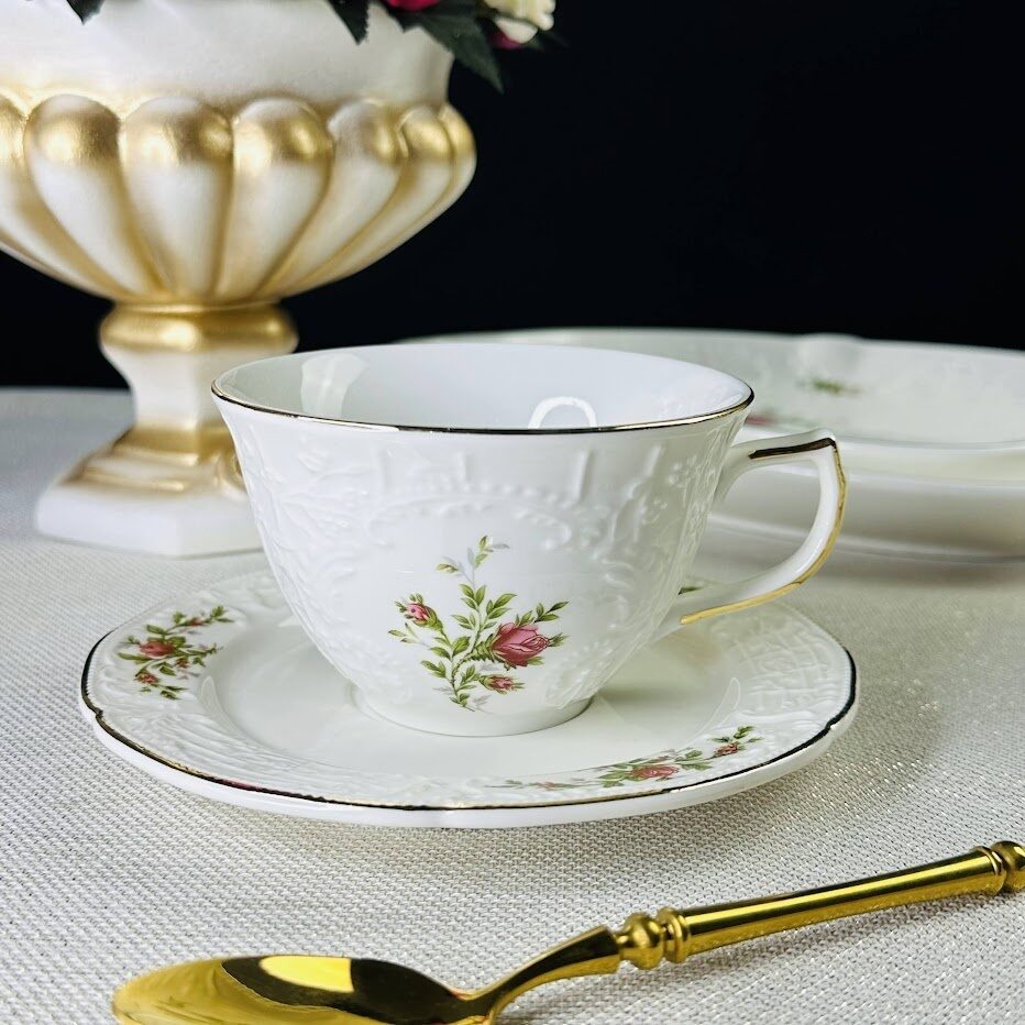 Коллекция ДОМИНИКА выполнена в стиле барокко и производится из белого фарфора c золотой каймой. Изделия украшены рельефным декором, изящно подчеркивающими благородство фарфора, узорные края выглядят элегантно и всегда в тренде посудной моды. В росписи фарфора излюбленным цветком считается роза, вот и мы решили расписать коллекцию английскими розами.
